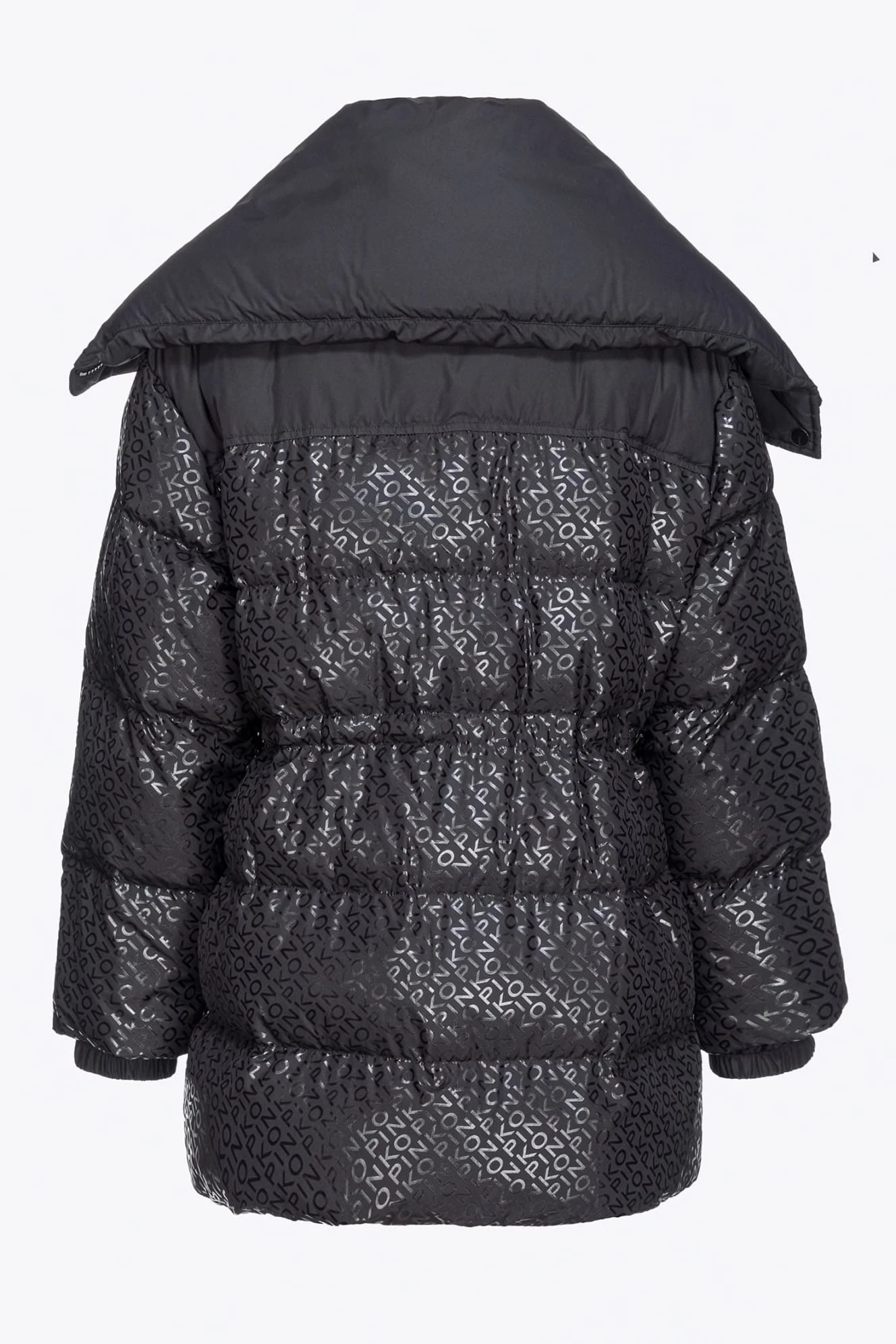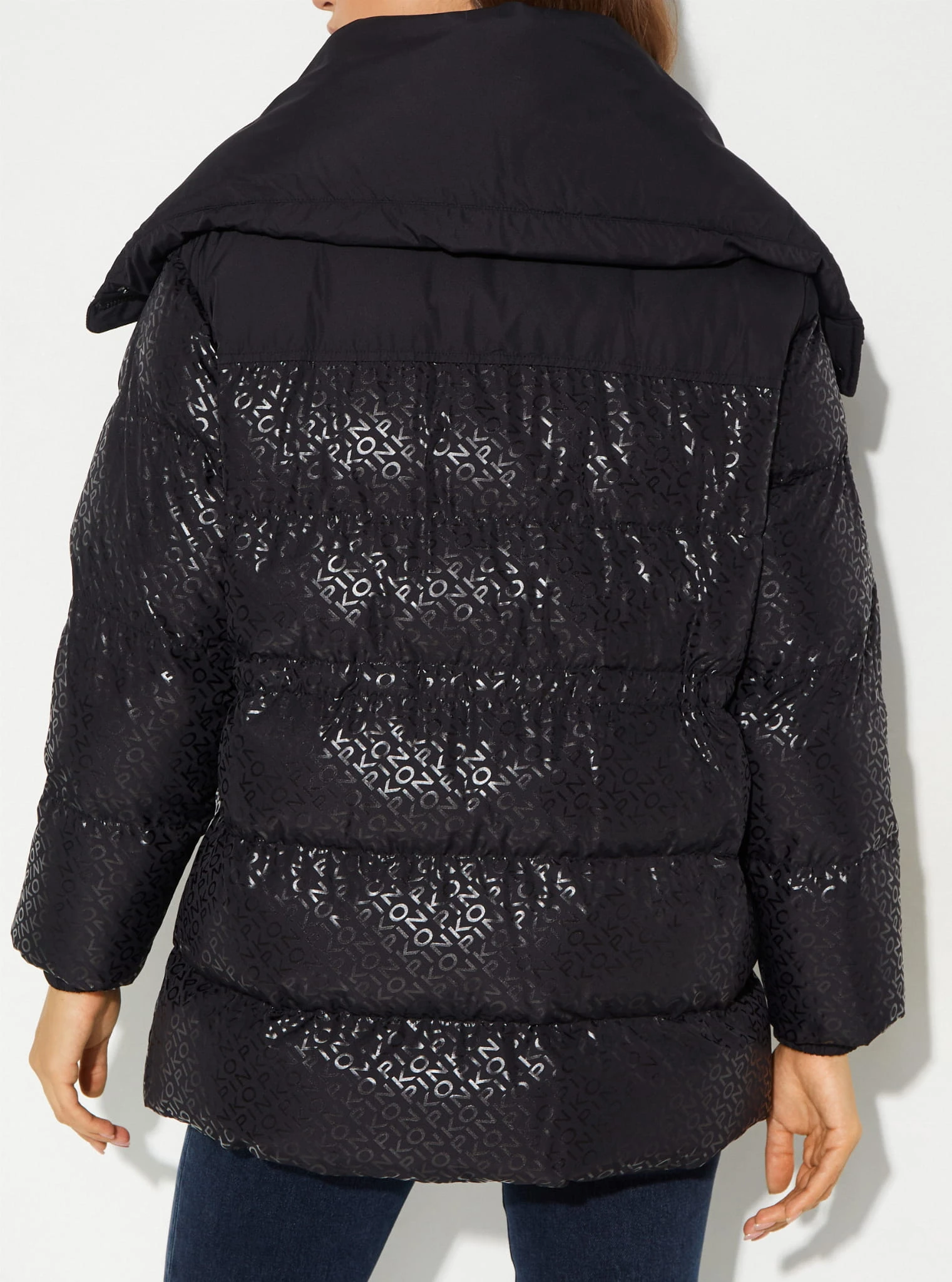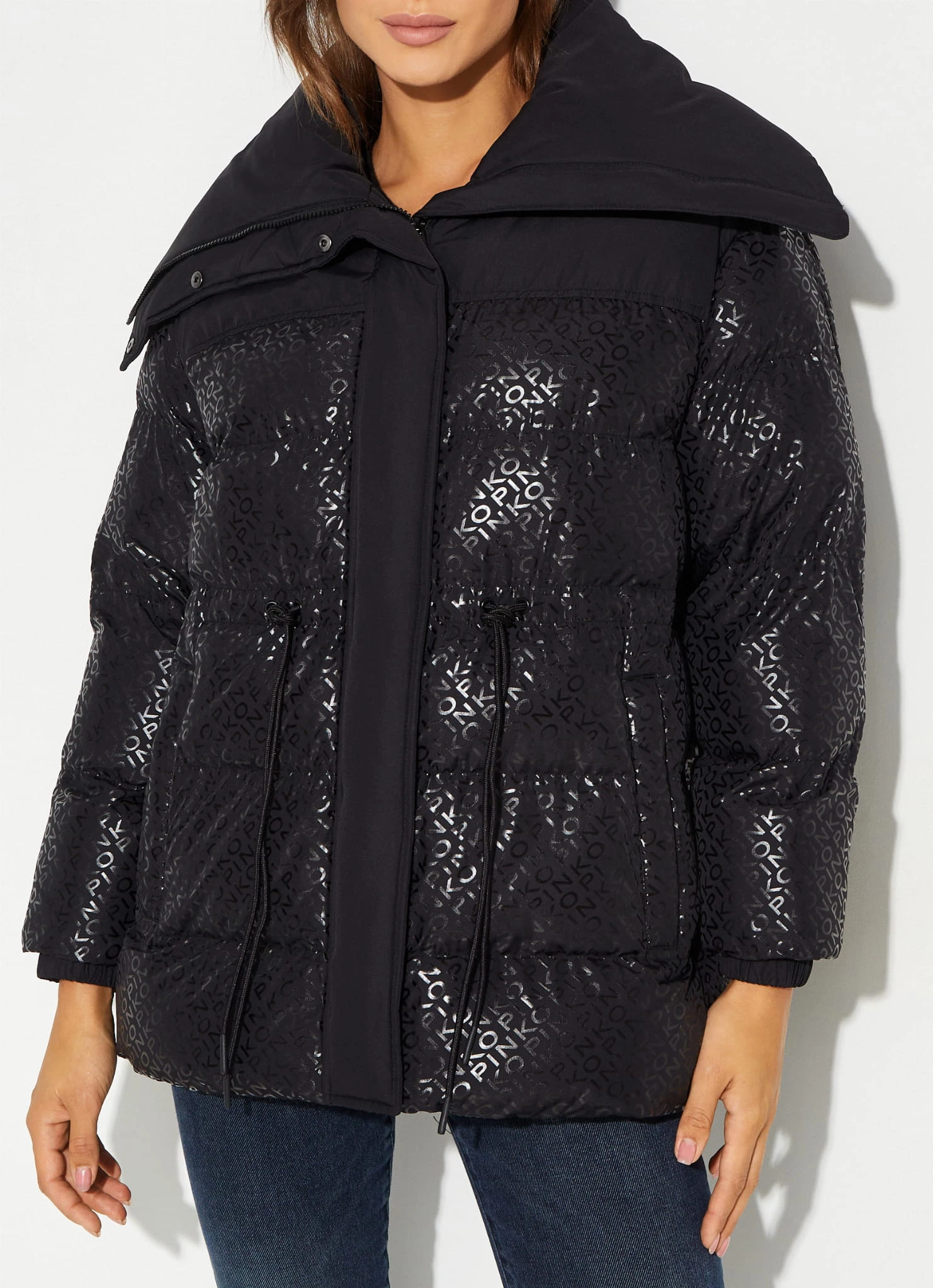 - Ocieplana kurtka puchowa o kroju bosmanki, wykonana z technicznego płótna z poziomym pikowaniem, spersonalizowana nadrukowanym napisem PINKO na całym przodzie, o specjalnym błyszczącym efekcie