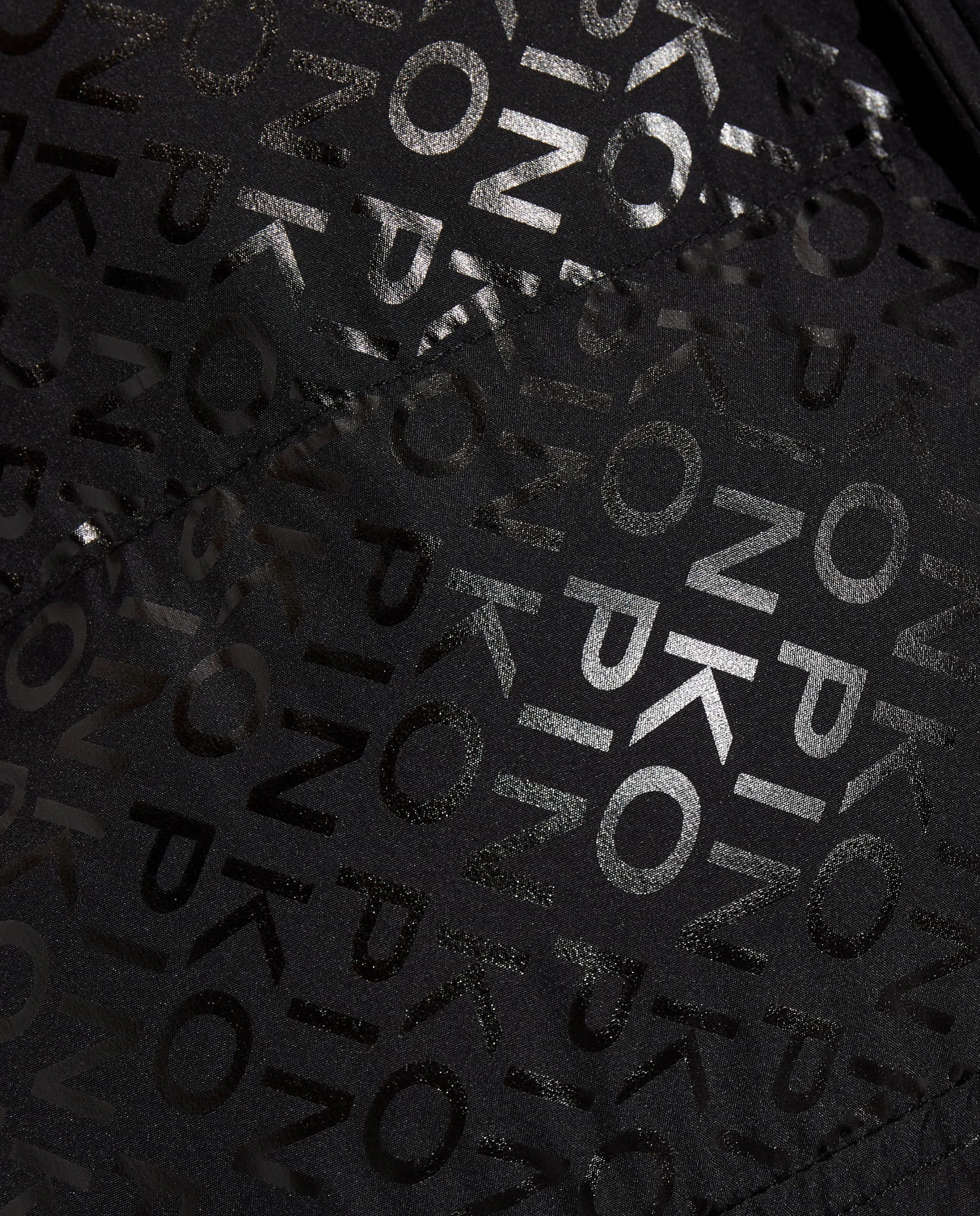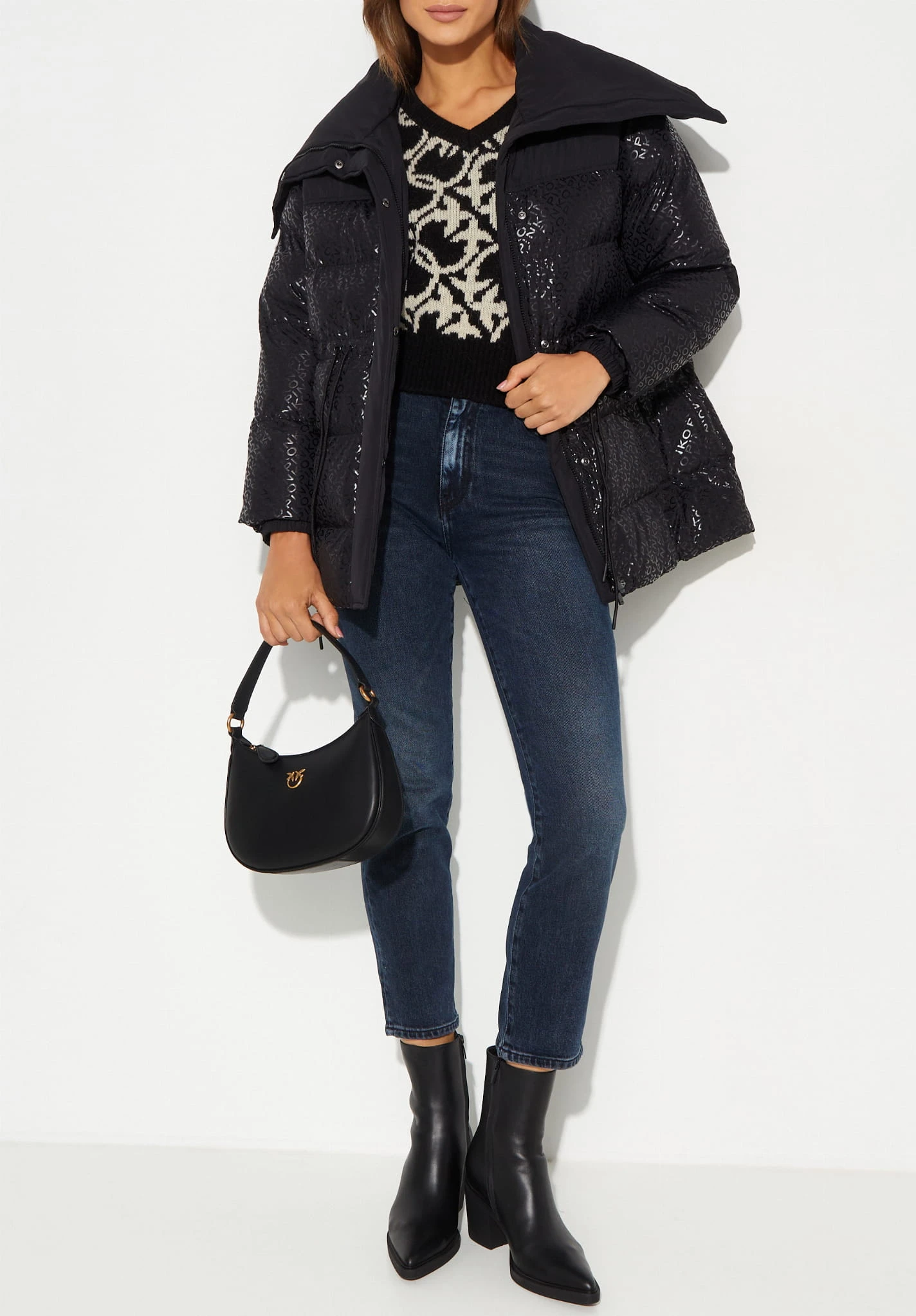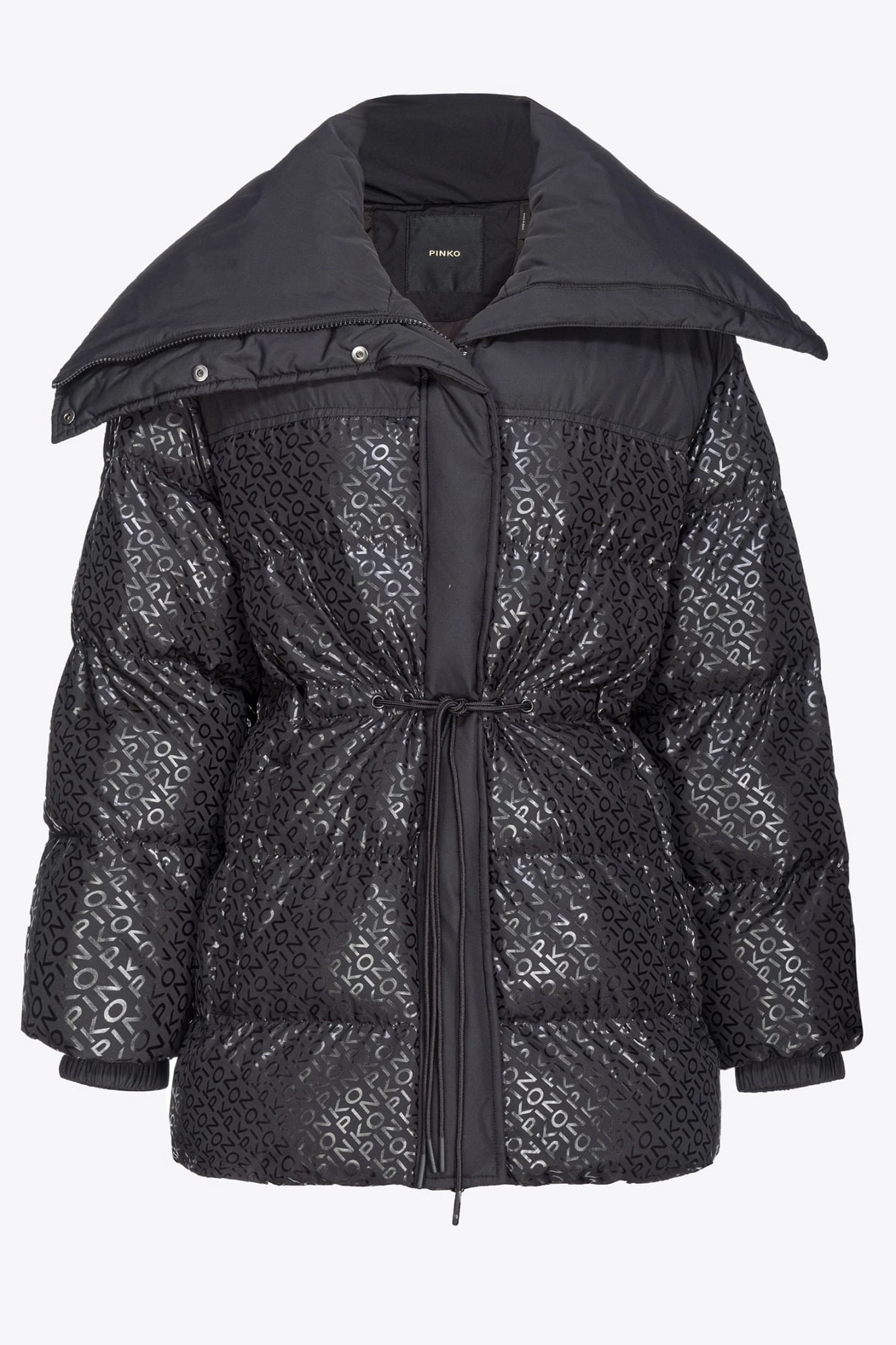- Ocieplana kurtka puchowa o kroju bosmanki, wykonana z technicznego płótna z poziomym pikowaniem, spersonalizowana nadrukowanym napisem PINKO na całym przodzie, o specjalnym błyszczącym efekcie
