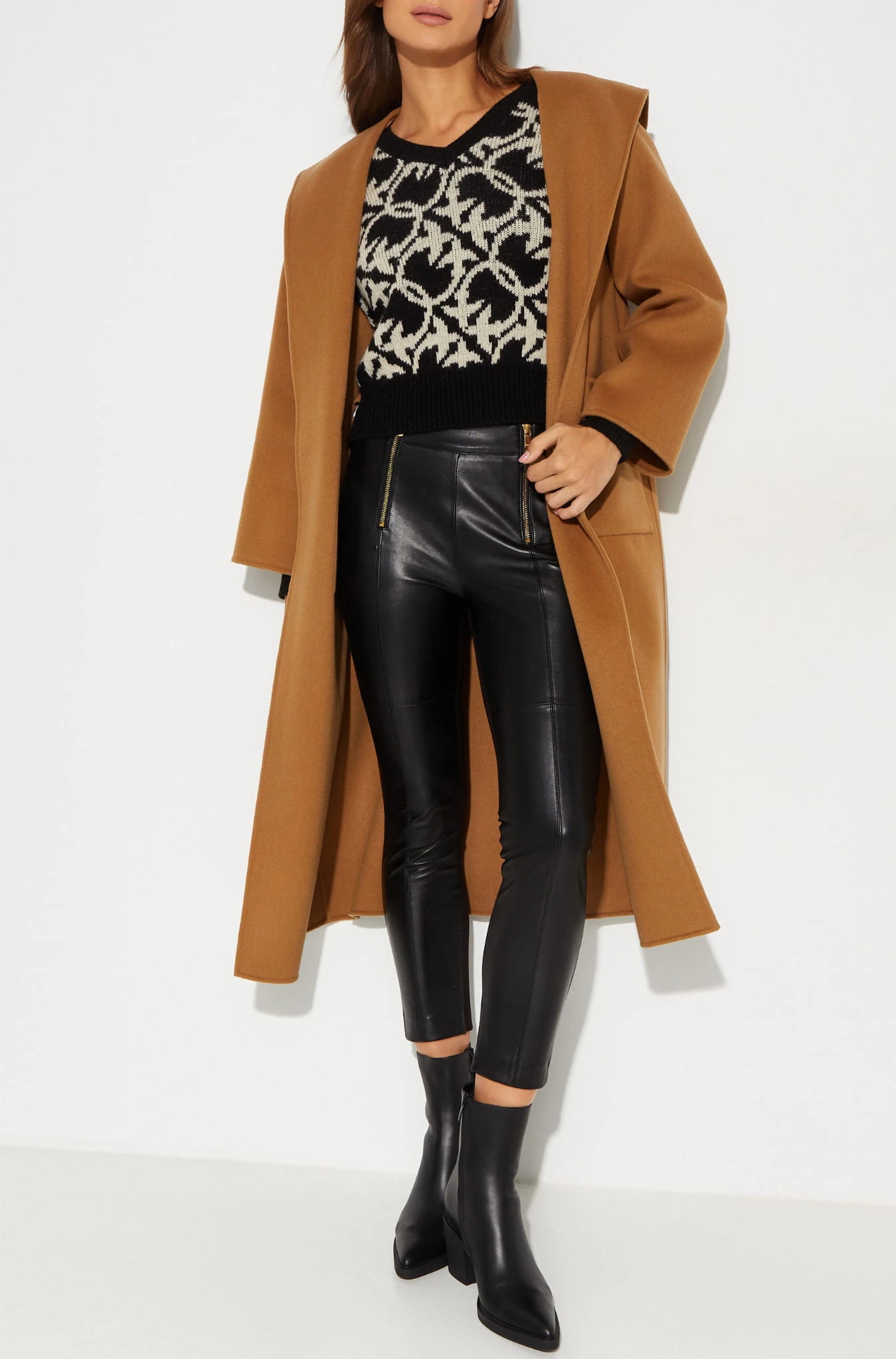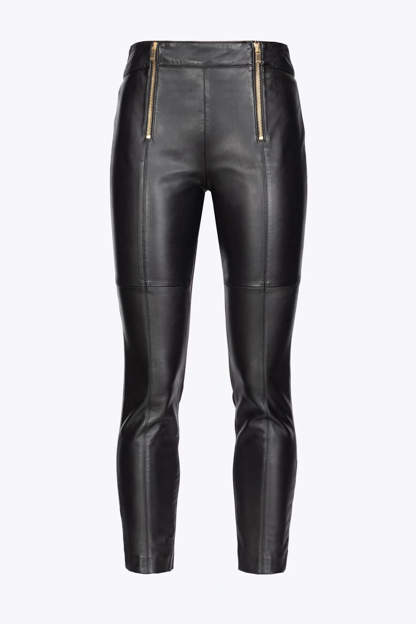 Czarne leginsy Lulu projektu marki Pinko to elegancka i nowoczesna propozycja. Przód wykonany z naturalnej skóry dodaje im luksusowego charakteru, podczas gdy z tyłu znajduje się elastyczna tkanina wiskozowa, zapewniająca komfort i dopasowanie.