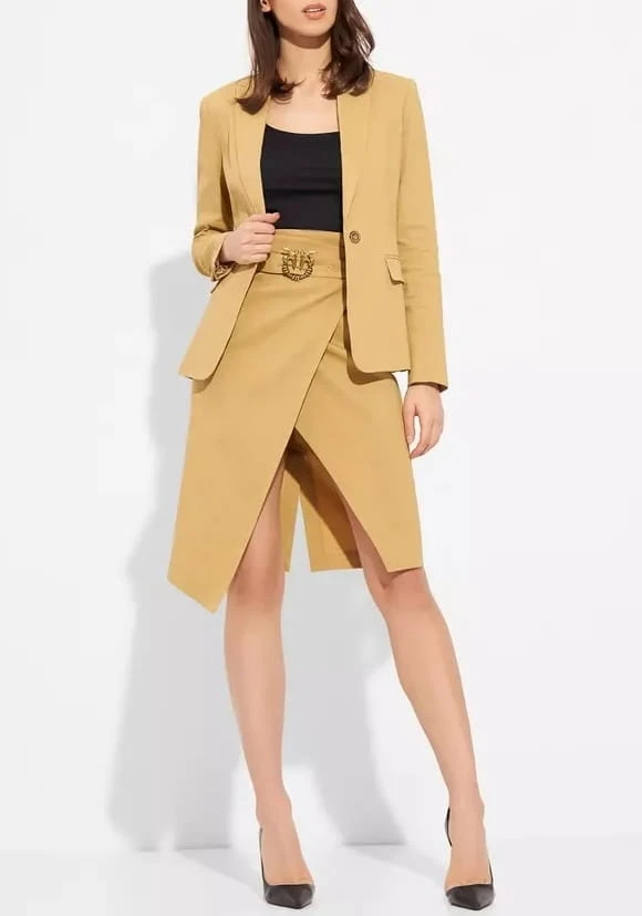 Marynarka Emoli marki PINKO w kolorze brązowym to elegancki model, który wyróżnia się subtelnym, ale modnym stylem. W zestawie znajduje się pasek z klamrą Love Birds, której ozdobny, pleciony motyw dodaje charakteru. Kołnierz z klapami nadaje jej klasycznego wyglądu, a długie rękawy dopełniają całość. Kieszenie z przodu są praktycznym detalem, a jednorzędowe zapięcie zapewnia prostą, ale elegancką linię. Marynarka łączy klasykę z nowoczesnymi akcentami, tworząc idealną propozycję na eleganckie okazje.