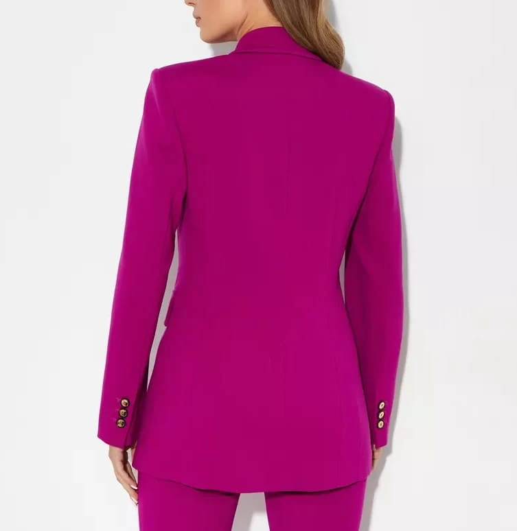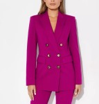 Fioletowa marynarka Glorioso marki Pinko to elegancki model, który wyróżnia się wyjątkowym kolorem i detalami. Ma dwurzędowe zapięcie, które nadaje jej klasyczny, ale wyrazisty wygląd. Trójkątne klapy stanowią interesujący element, który przyciąga wzrok i nadaje marynarce nowoczesnego charakteru. Długie rękawy z mankietami dopełniają całość, podkreślając elegancki fason. Marynarka posiada także podkreśloną talię, co podkreśla sylwetkę, oraz kieszenie z patkami, które dodają jej funkcjonalności i stylu. To doskonały wybór dla osób szukających marynarki, która łączy klasykę z nowoczesnymi akcentami.