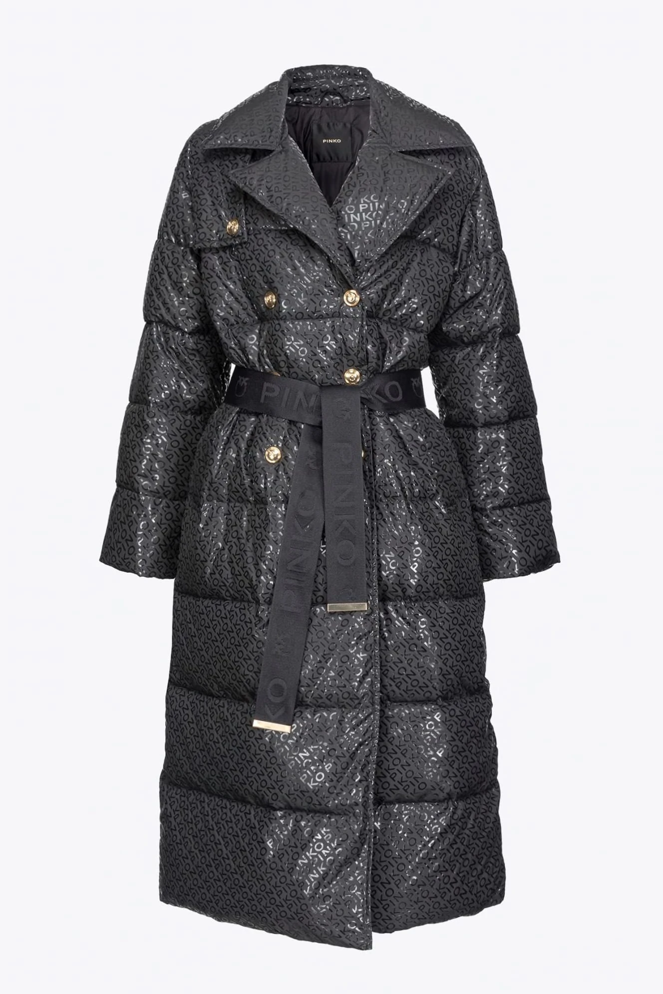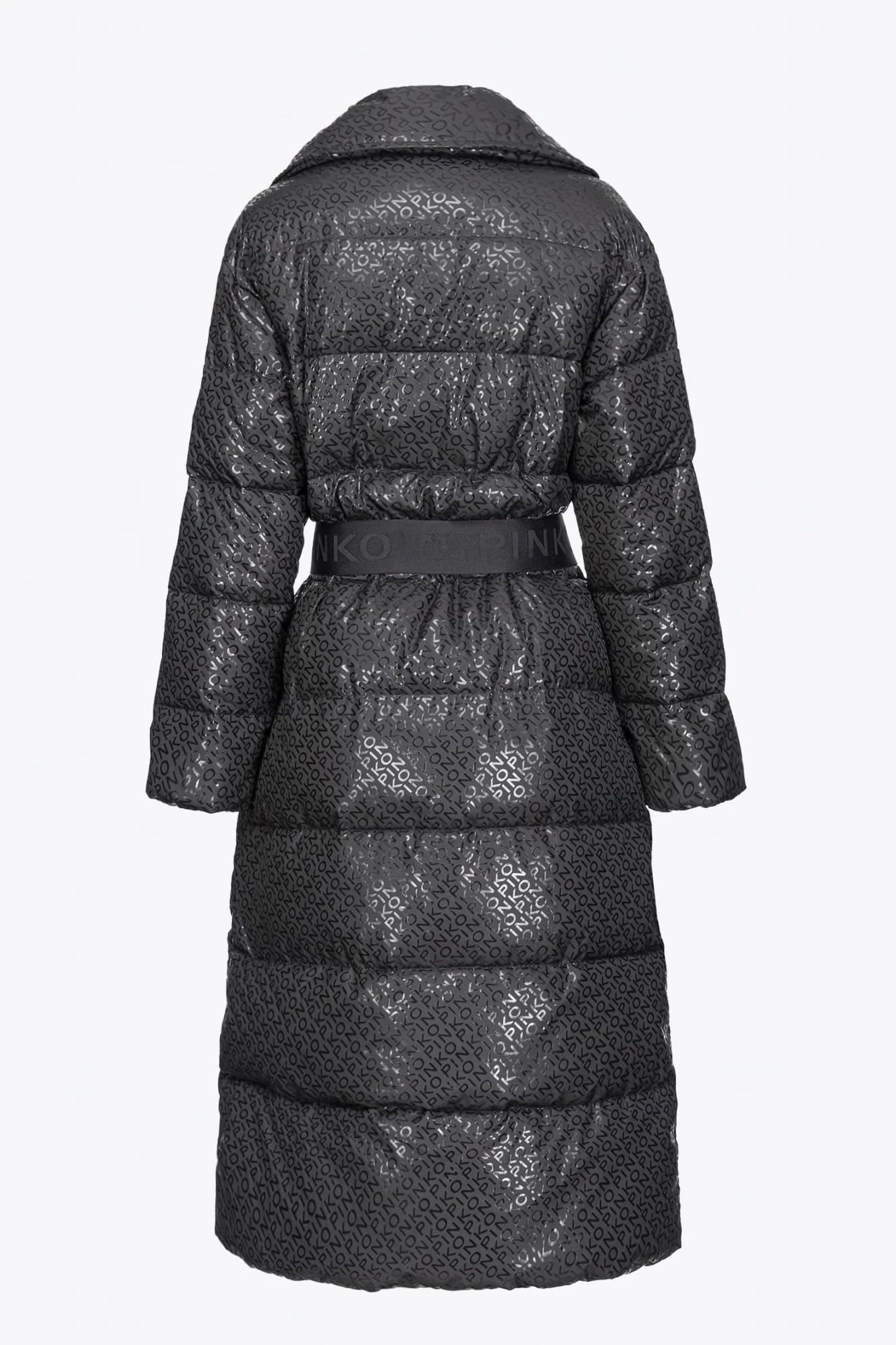 - Długa ocieplana kurtka puchowa wykonana z technicznego płótna z poziomym pikowaniem, spersonalizowana nadrukowanym na całym przodzie napisem PINKO o specjalnym błyszczącym efekcie