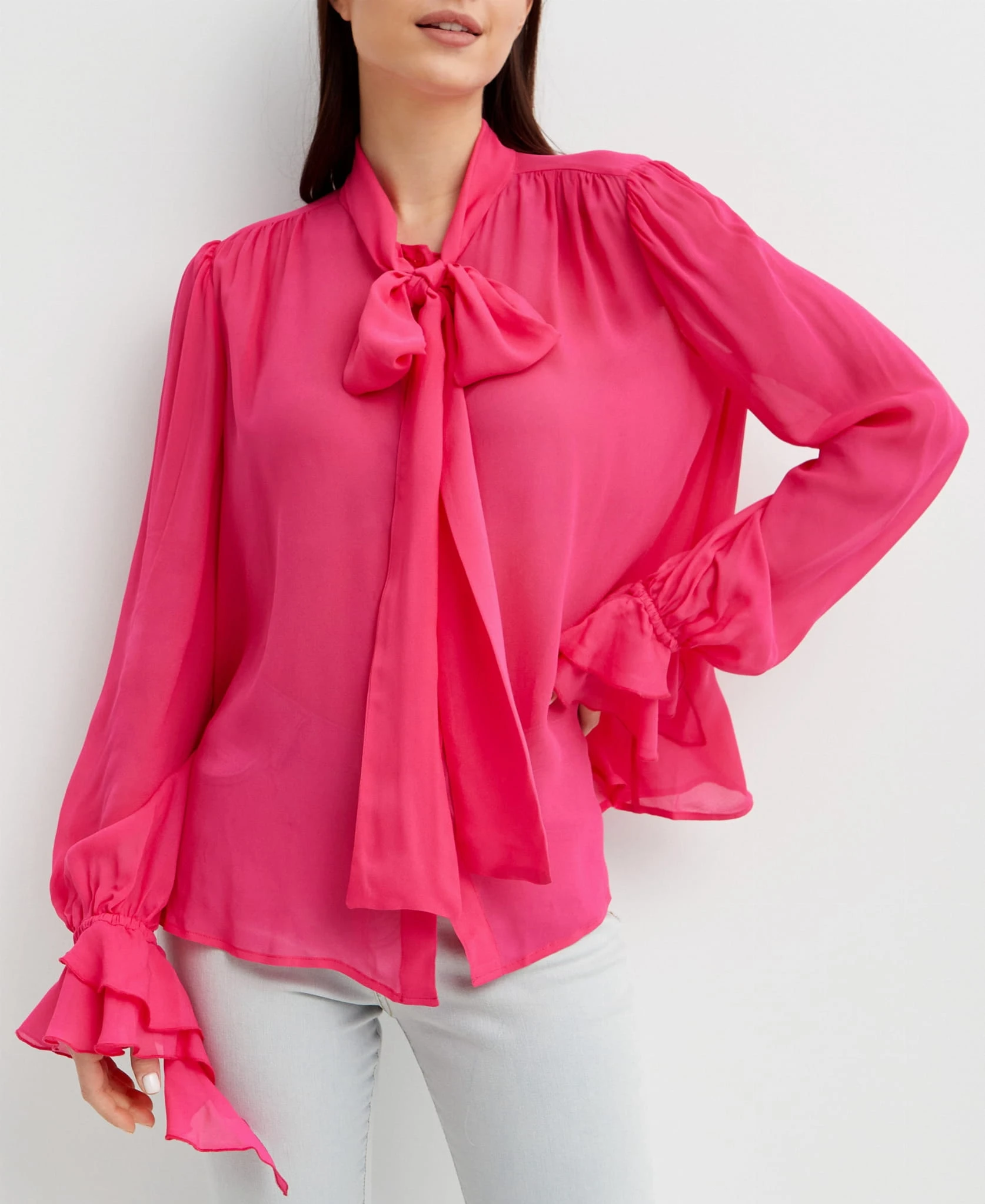 Ta bluzka to nie tylko ubranie, to historia finezji i wyrafinowanego stylu. Wykonana z wiskozowej żorżety, materiału, który wyśmienicie koi skórę, nadając przyjemny, lekki dotyk.