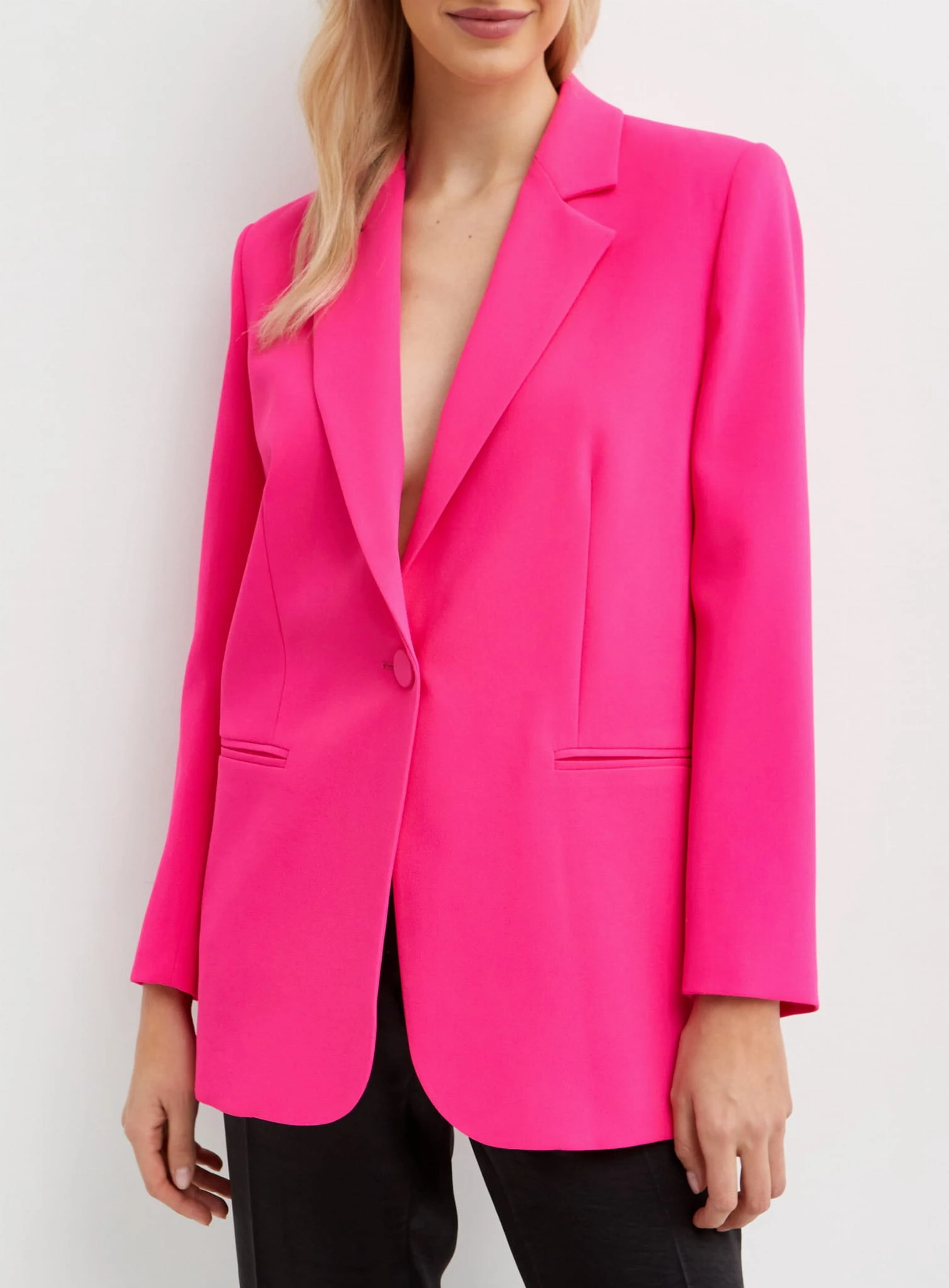 Kolor fuksji, odcień N17 Pink Pinko, to wyrazista nuta, która przyciąga wzrok i dodaje energii każdej stylizacji. Ta marynarka to nie tylko ubranie – to manifestacja indywidualności i klasy, która sprawi, że każdy dzień będzie pełen pewności siebie i elegancji.
