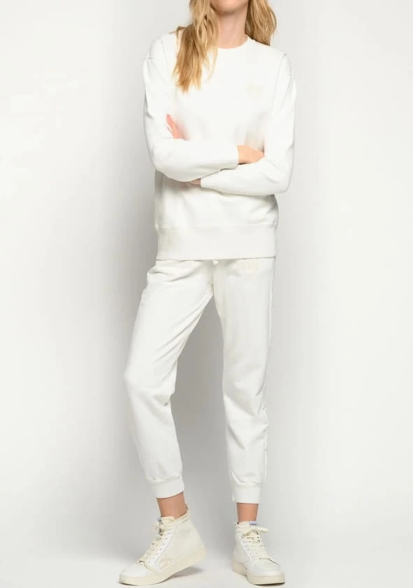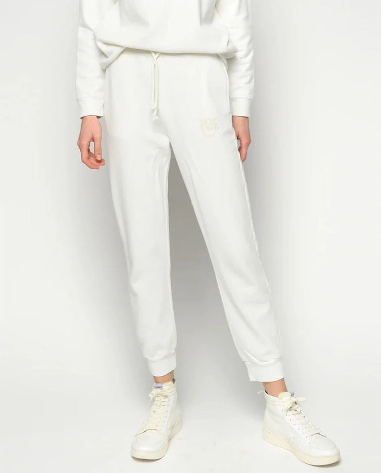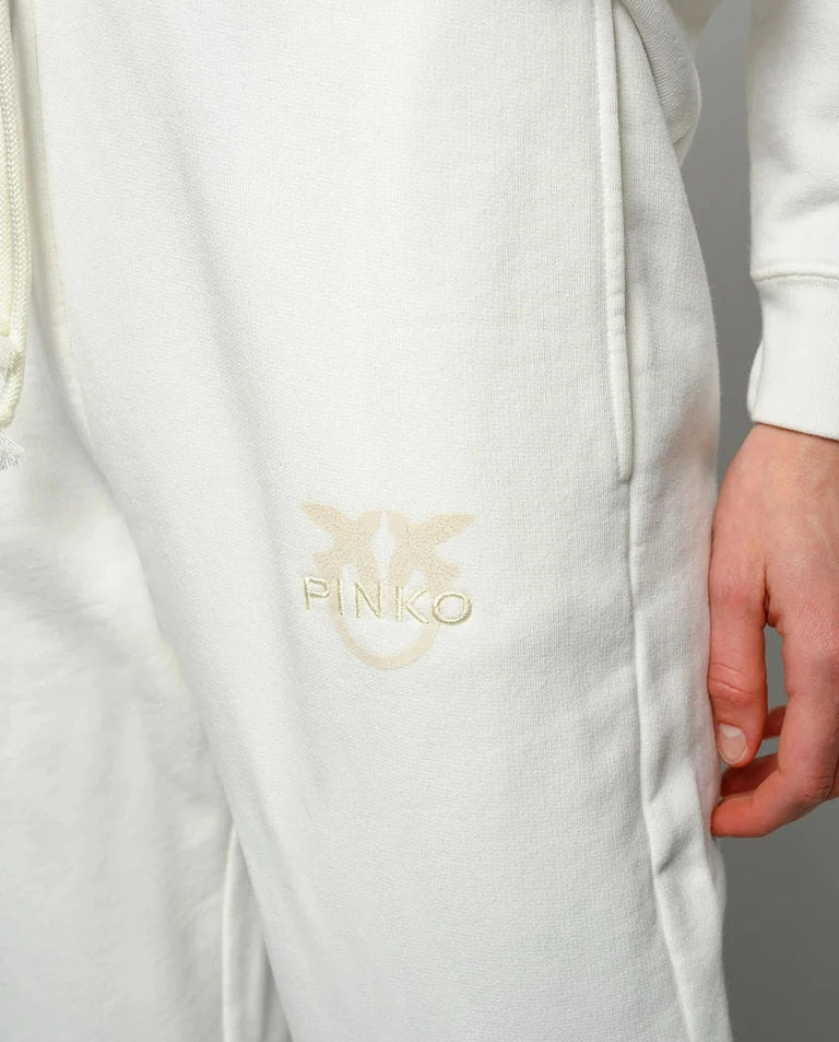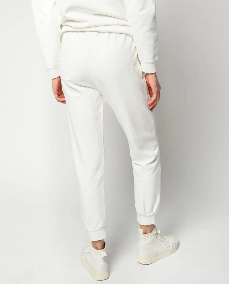 Białe, dresowe spodnie Carico włoskiej marki Pinko to idealne połączenie stylu, komfortu i ekologii. Wykonane z wysokiej jakości organicznej bawełny, są przyjazne dla skóry i środowiska. W pasie posiadają elastyczny ściągacz z wiązaniem, który zapewnia doskonałe dopasowanie, a u dołu nogawek znajdują się ściągacze nadające sportowy charakter.