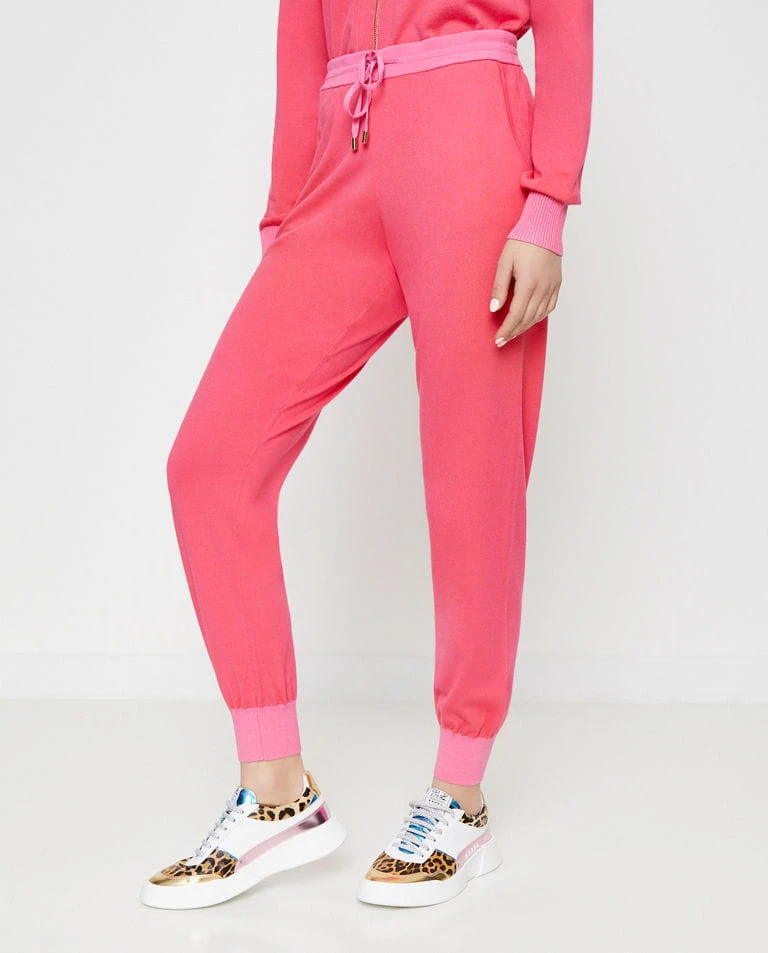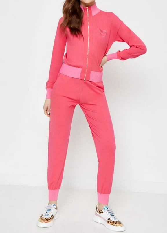 Różowe, dresowe spodnie Punteggio marki Pinko to stylowy wybór dla kobiet ceniących komfort i modny wygląd. Wykonane z wysokiej jakości tkaniny wiskozowej, zapewniają miękkość i wygodę noszenia. W pasie mają praktyczny ściągacz z wiązaniem, a u dołu nogawek elastyczne ściągacze, które podkreślają ich sportowy charakter.