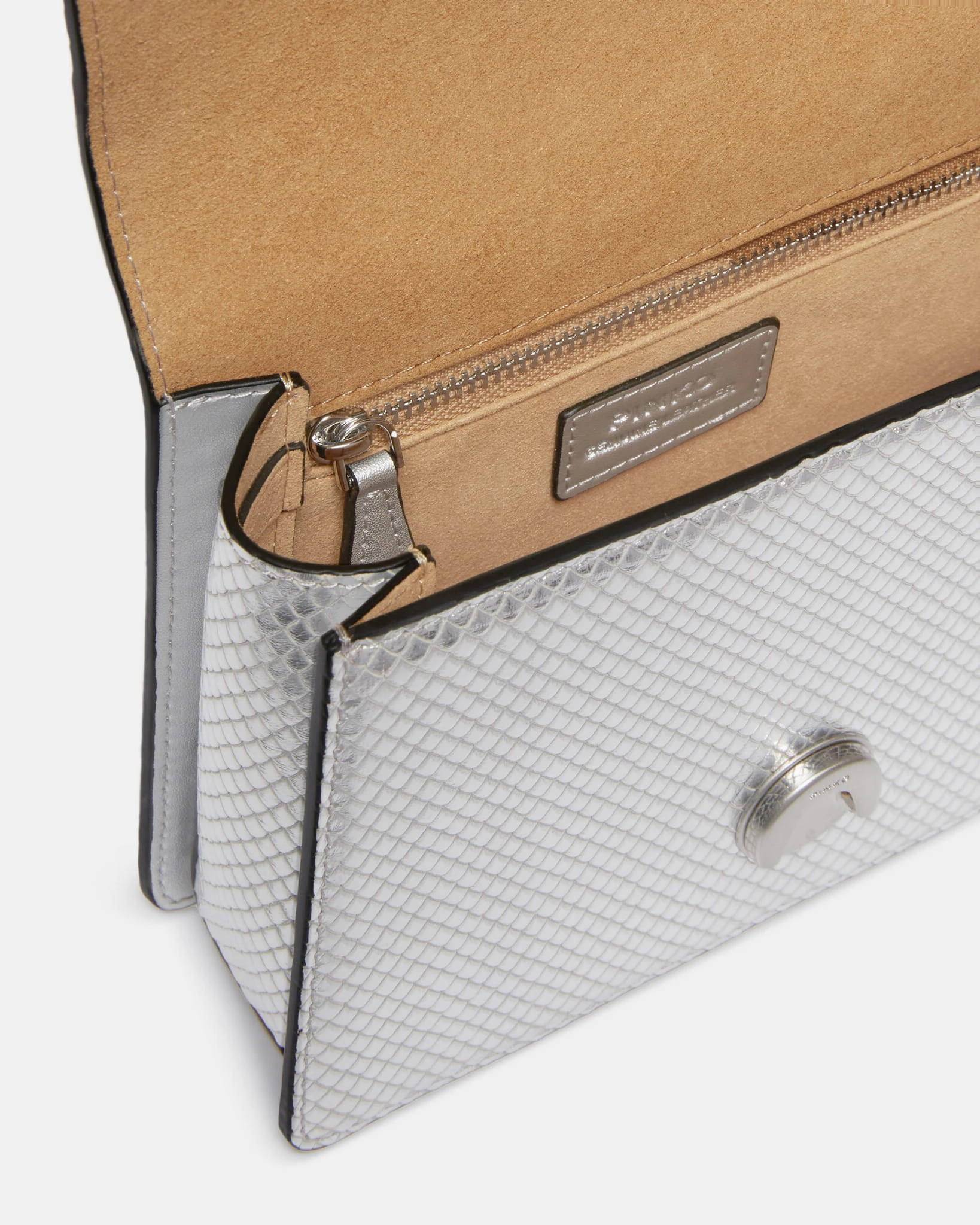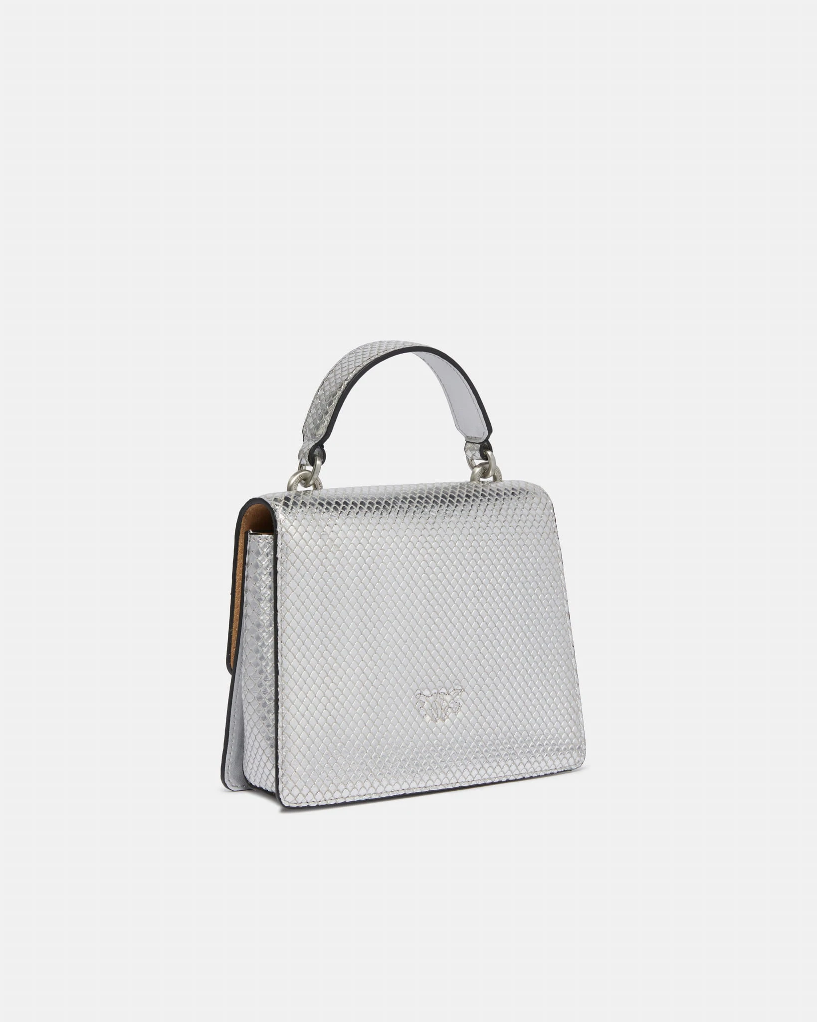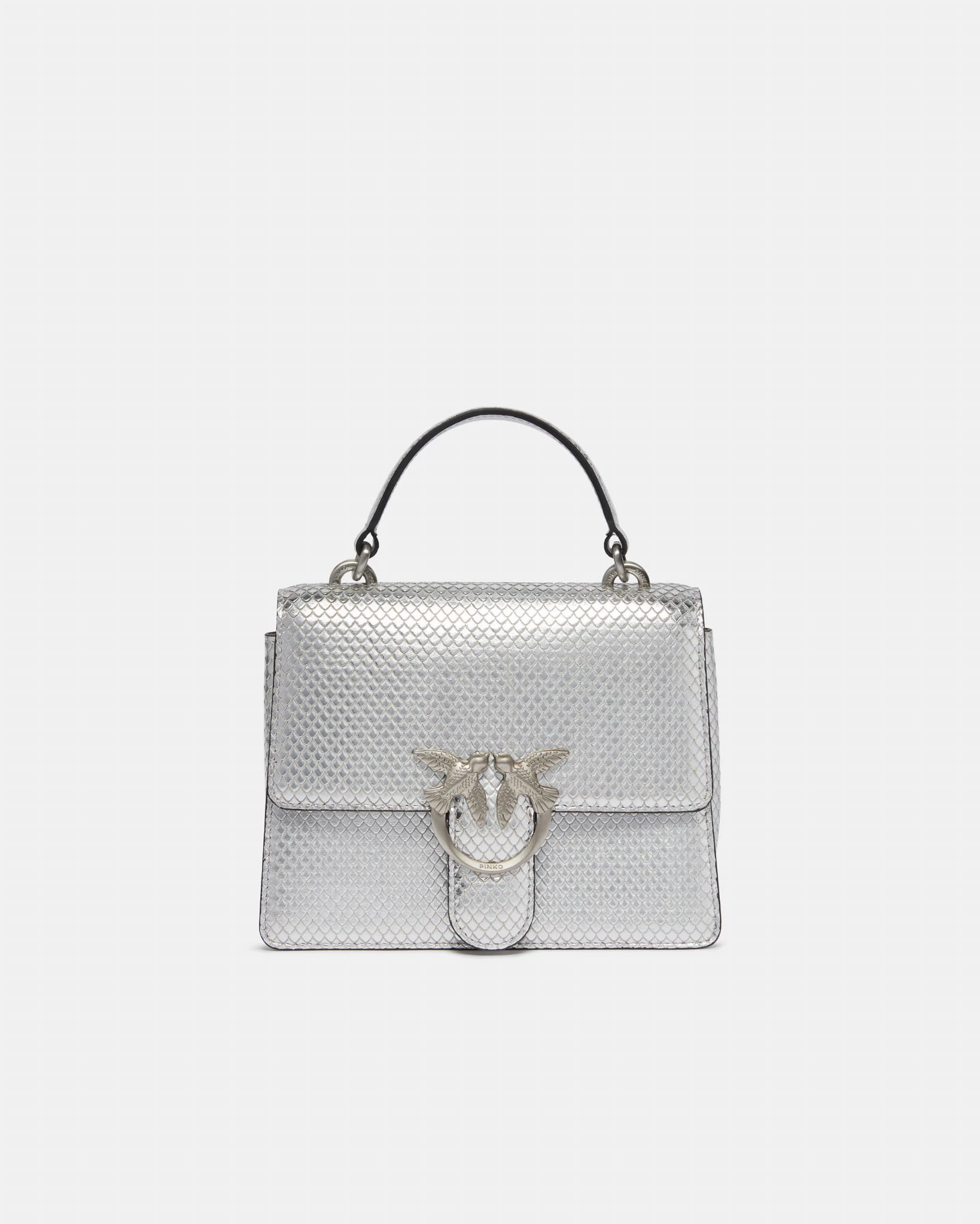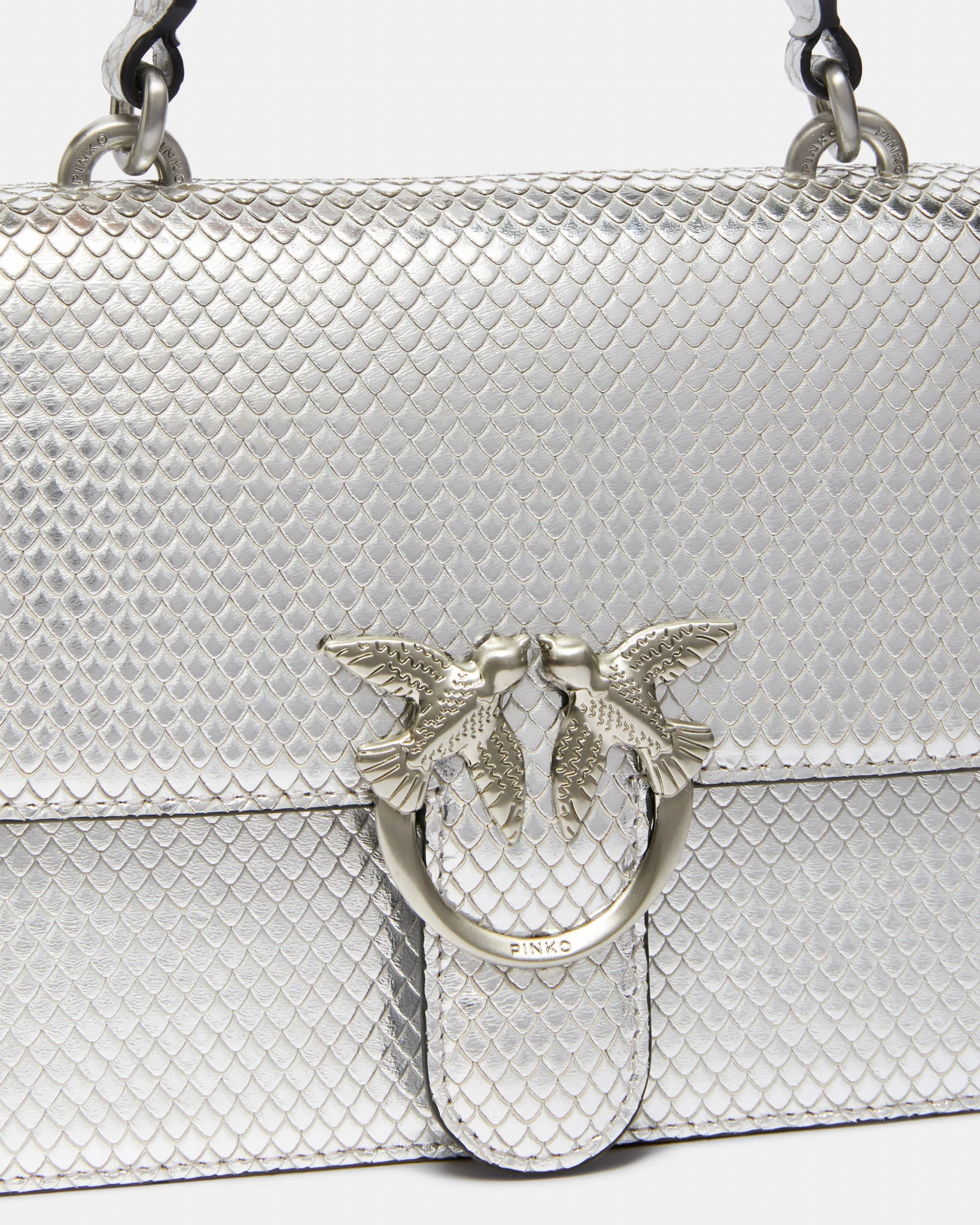 Torebka marki Pinko, model Mini Saddle Bag Top Handle w kolorze srebrnym. Z charakterystycznymi nacięciami przypominającymi łuski płaza, zapięcie z patką i klamerką Love Birds. Posiada uchwyt do trzymania w dłoni oraz odpinany długi pasek z metalowego łańcuszka. Wnętrze wykończone podszewką z mikrofibry. Wykonana ze skóry imitującej pytona, łącząc nowoczesny design z luksusowym wyglądem.