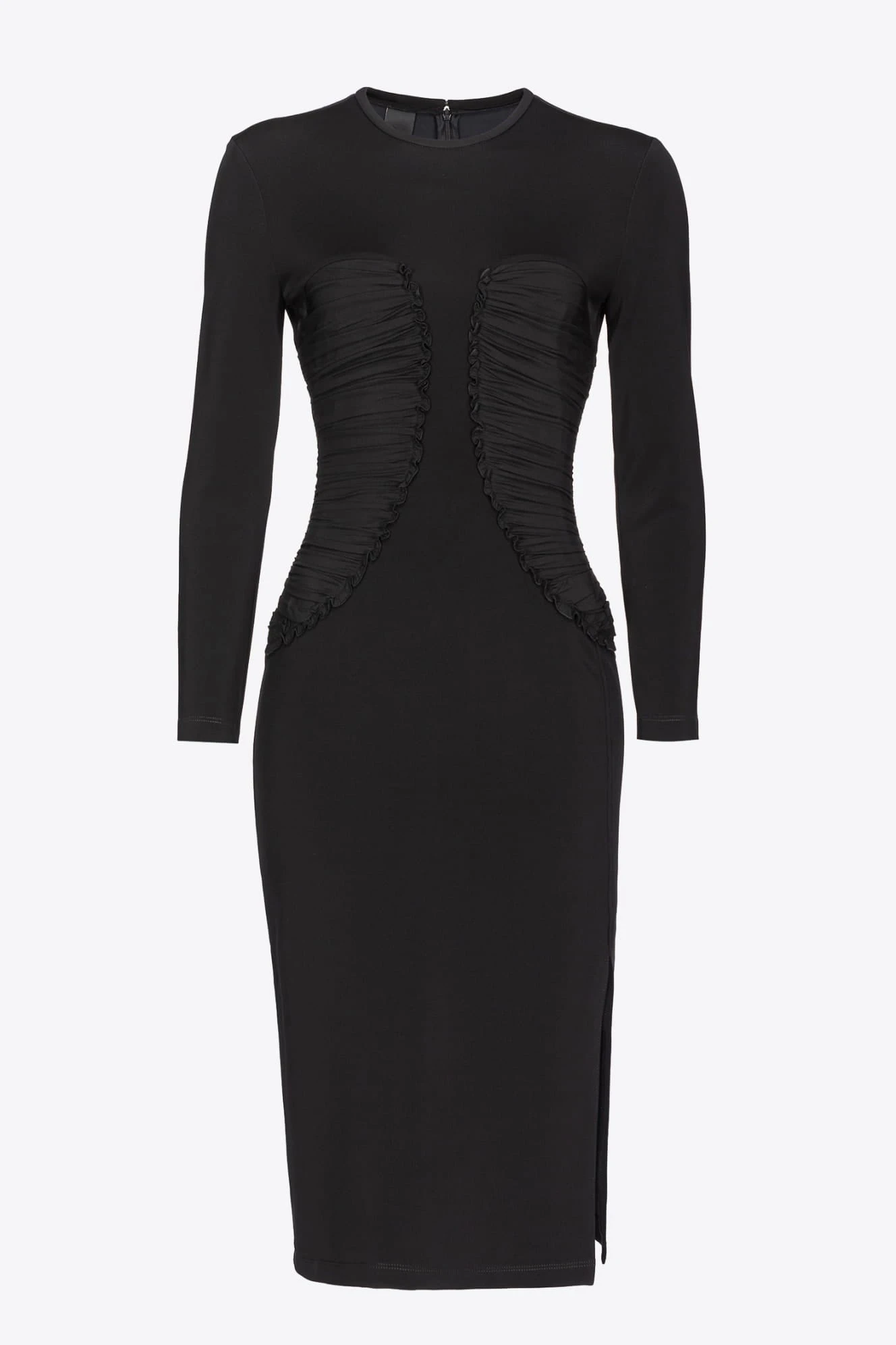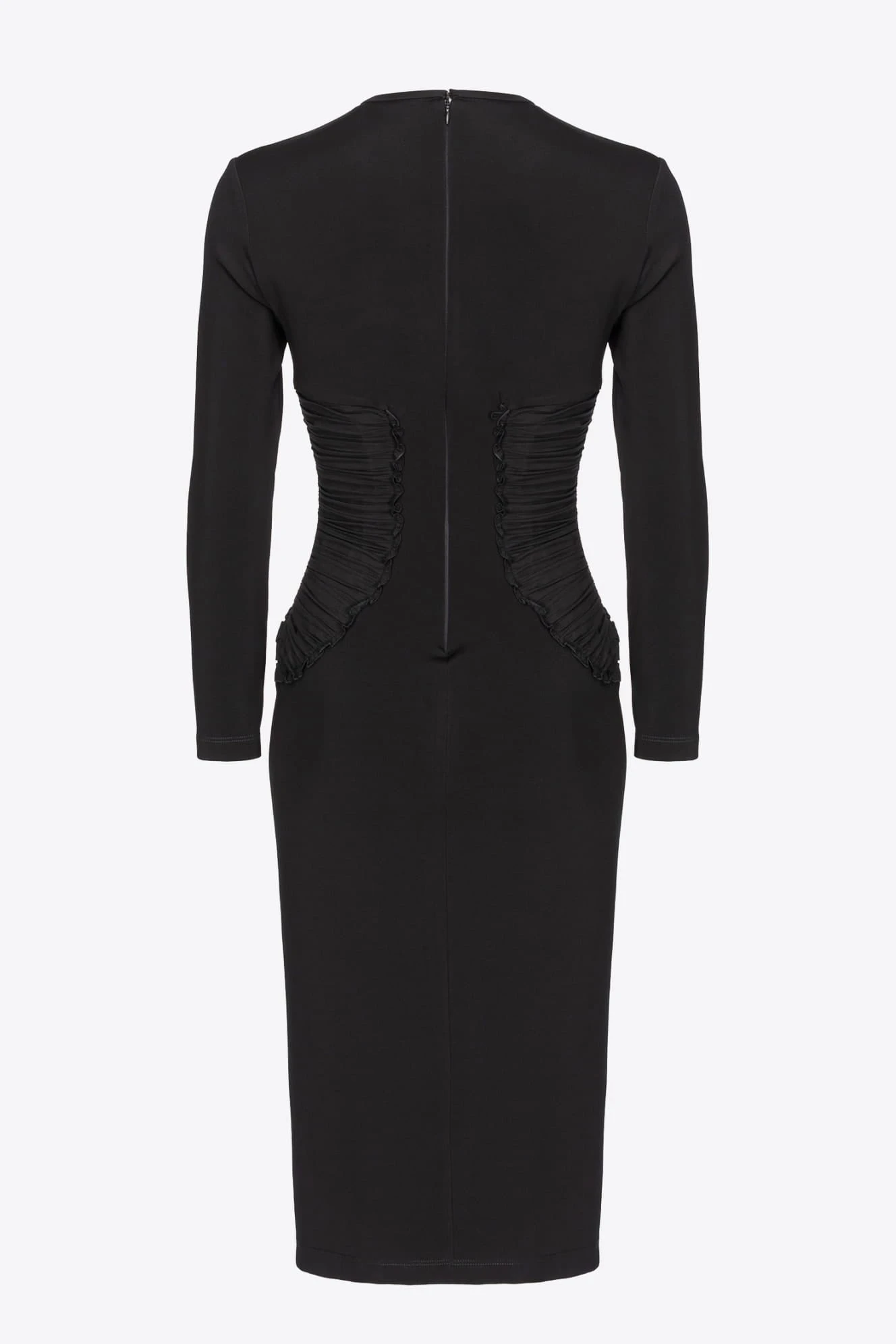 - Sukienka ołówkowa z elastycznej, wiskozowej tkaniny technicznej imitującej neopren, z marszczonymi detalami z elastycznej żorżety na biodrach