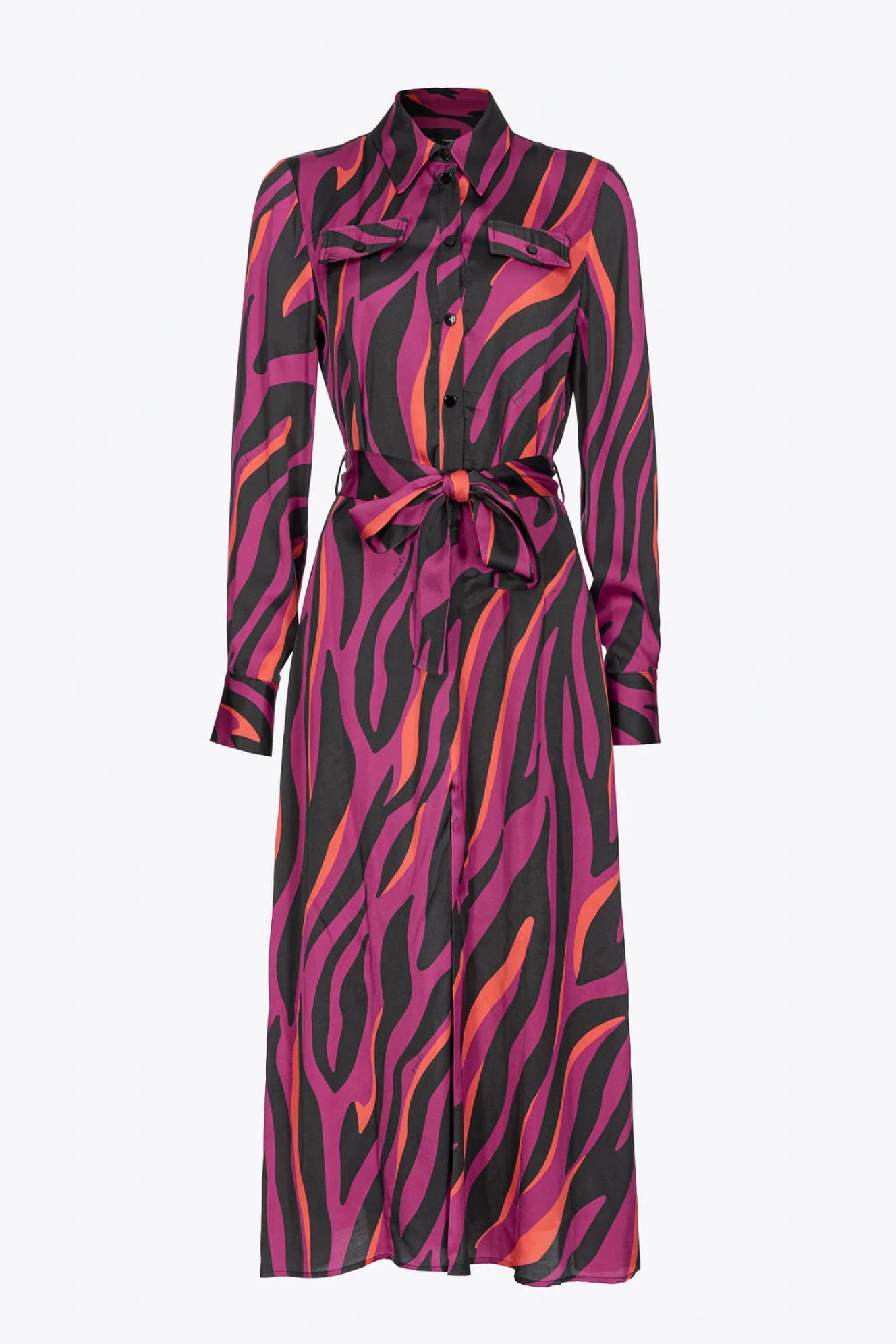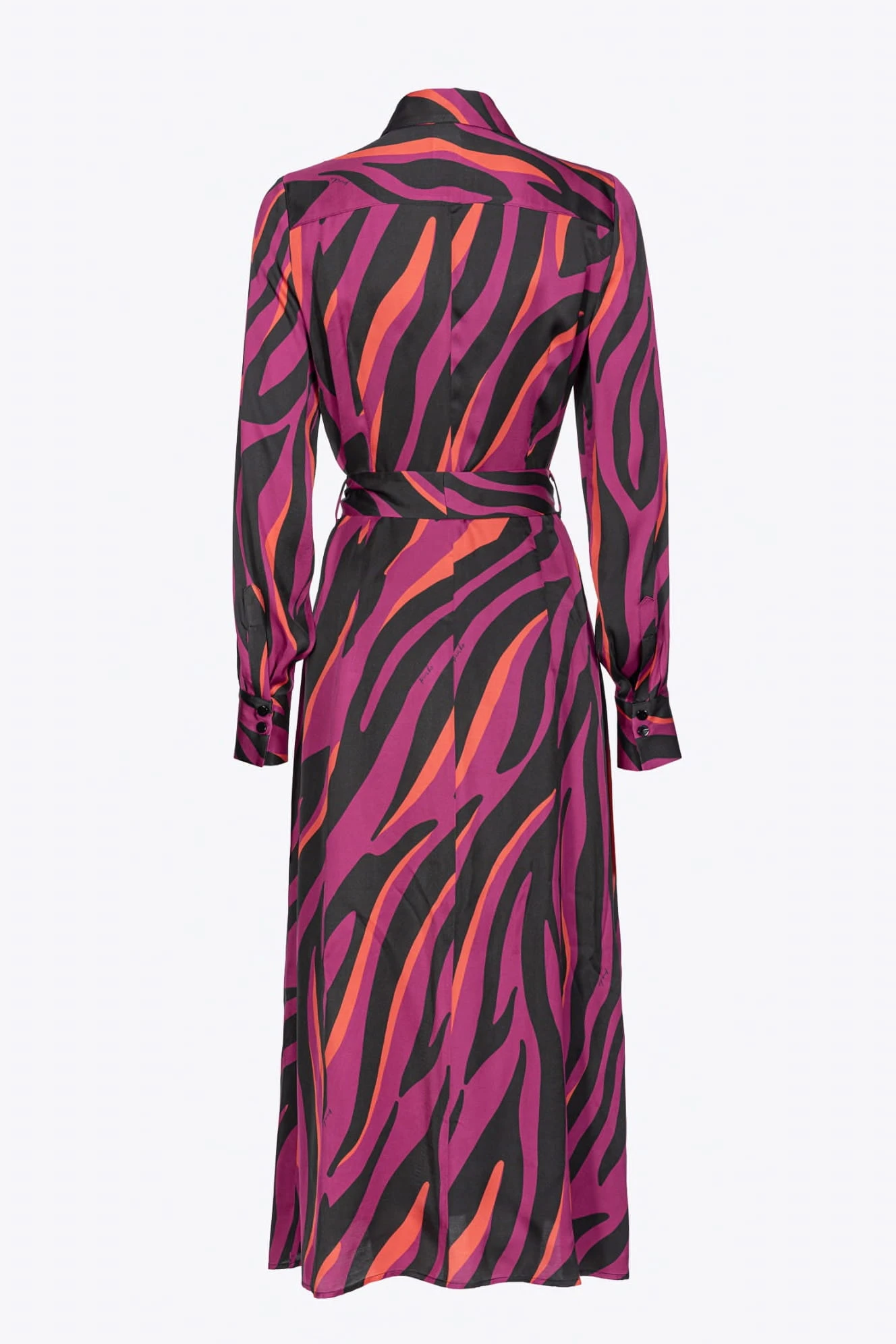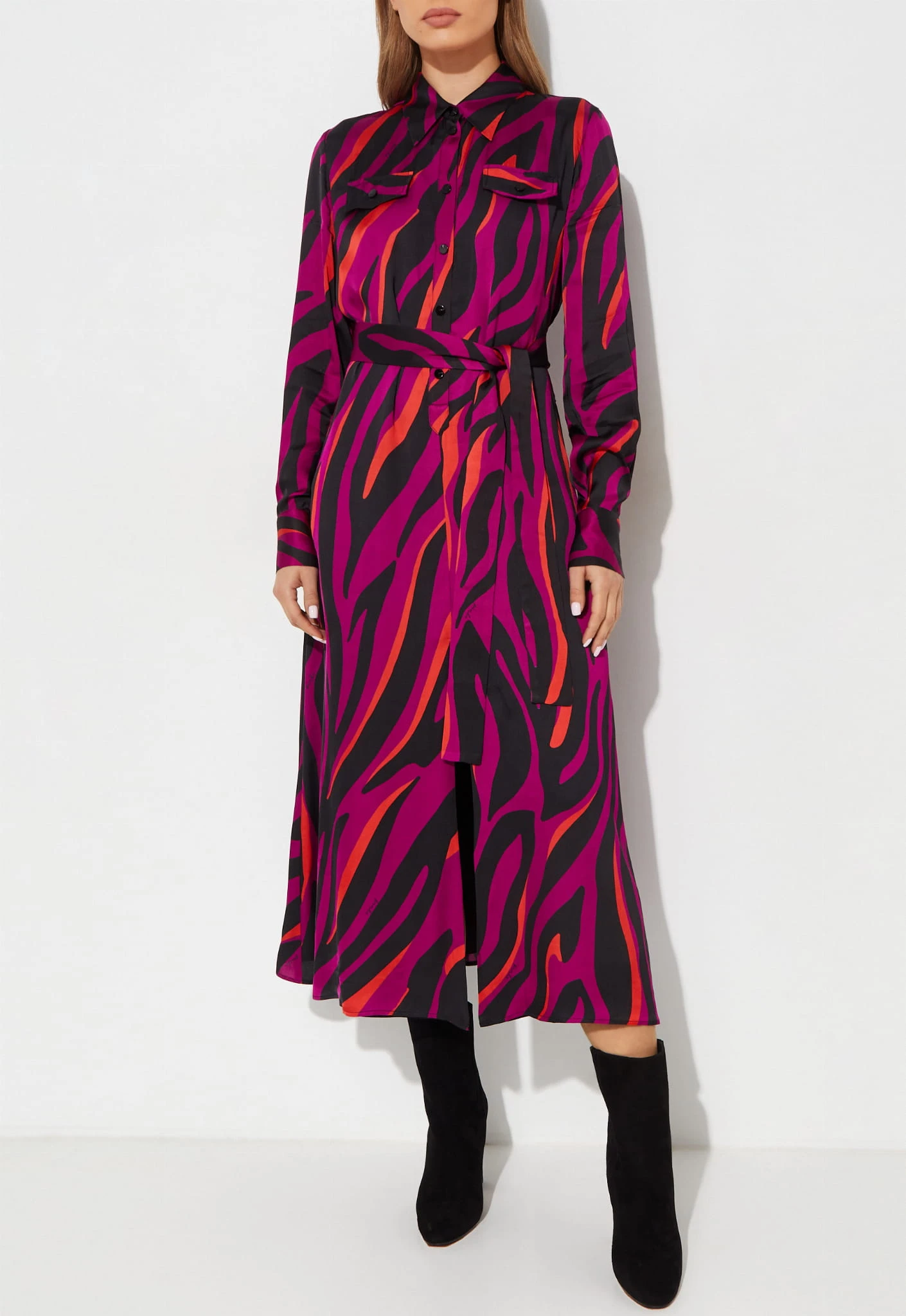- Maxi sukienka szmizjerka uszyta z satyny wiskozowej ze zwierzęcym nadrukiem w zeberkę w kolorach tworzących psychodeliczny efekt