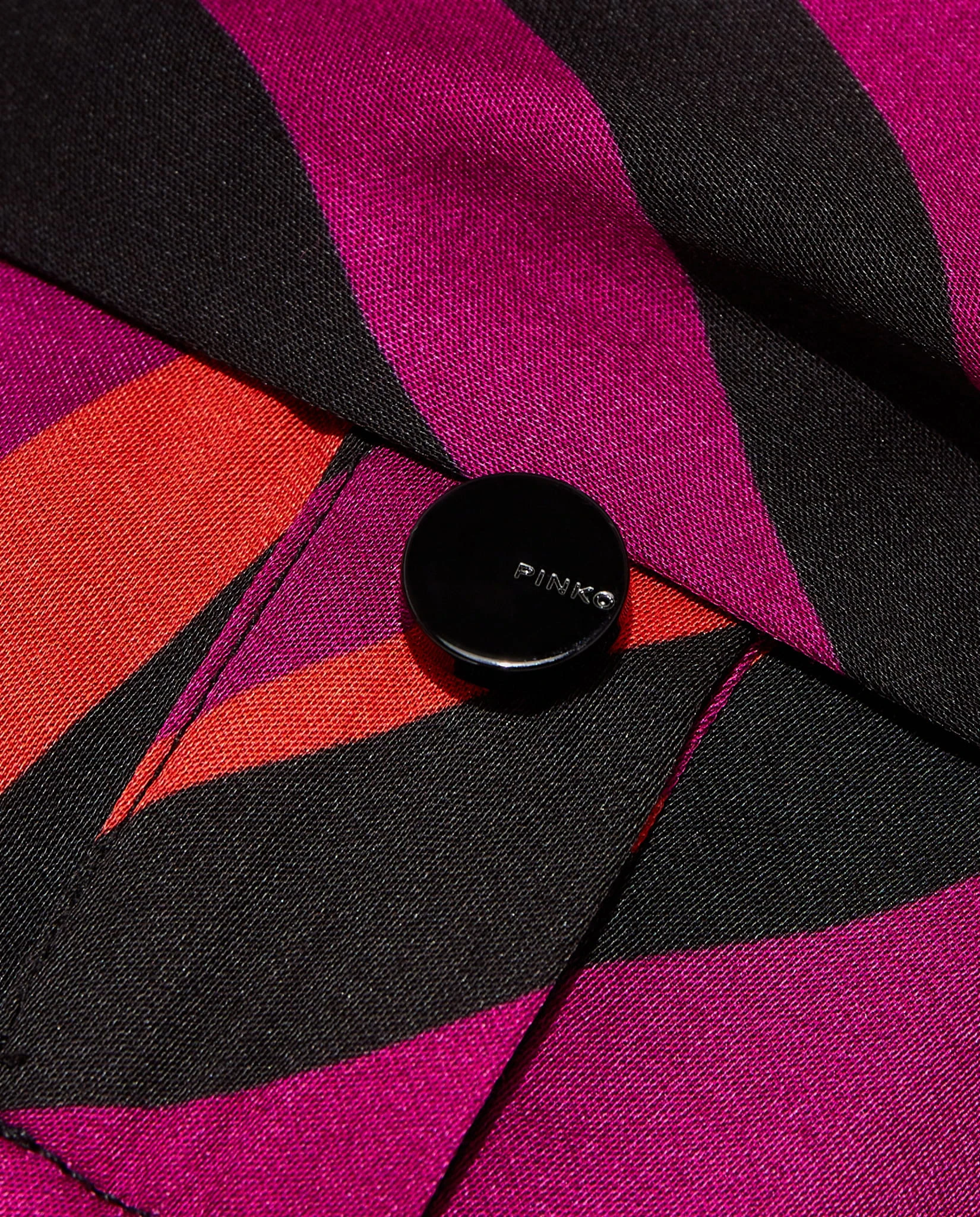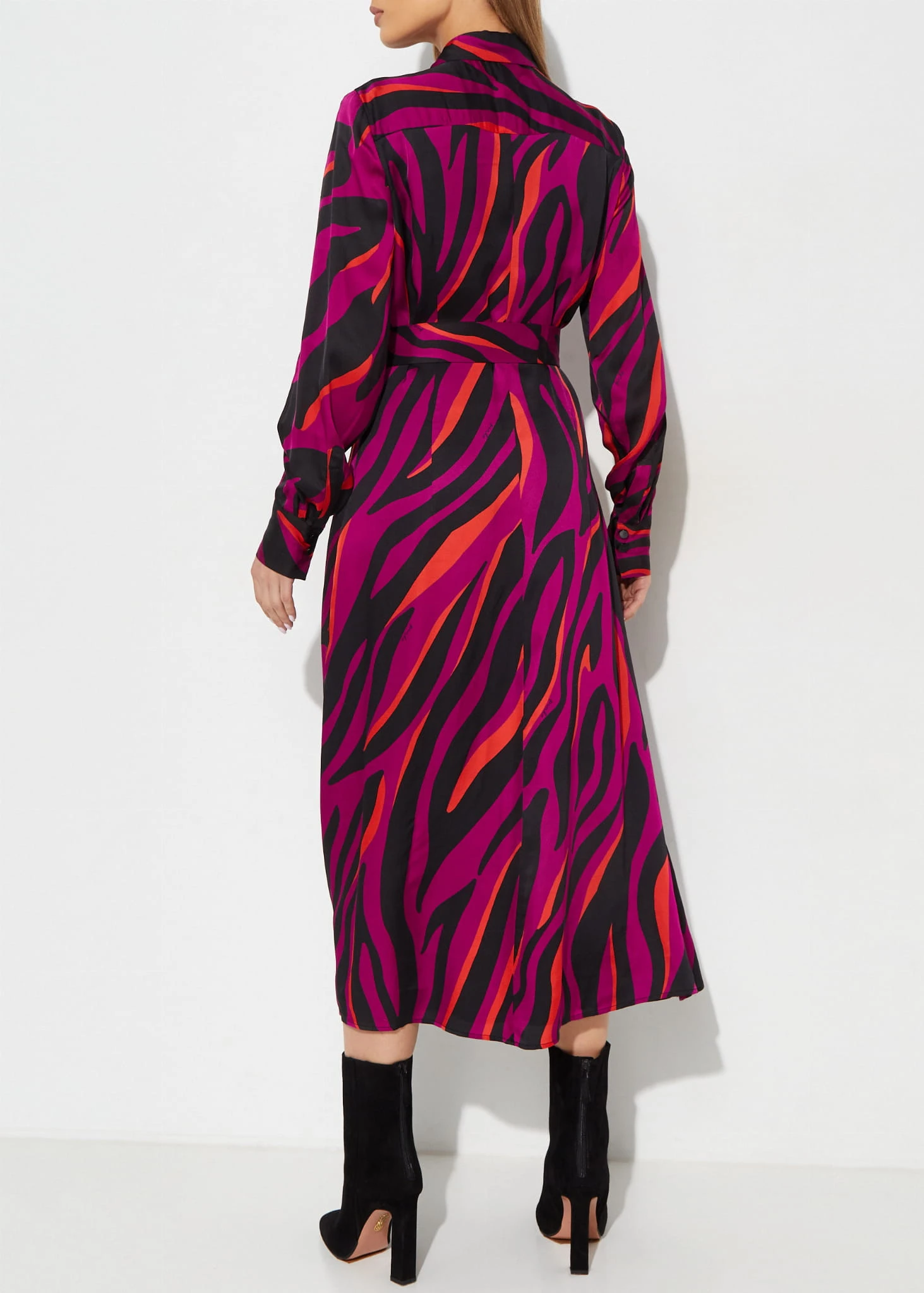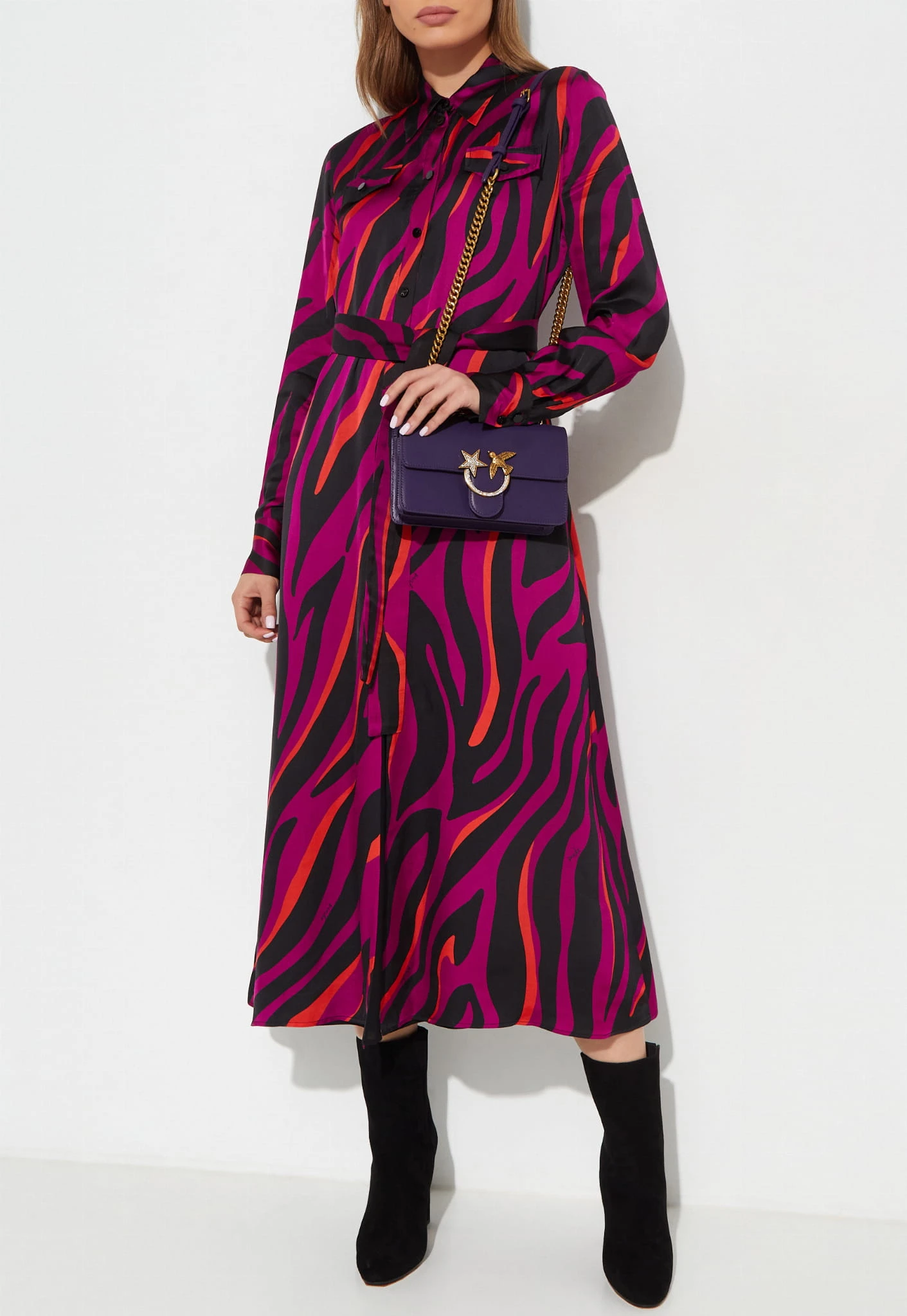 - Maxi sukienka szmizjerka uszyta z satyny wiskozowej ze zwierzęcym nadrukiem w zeberkę w kolorach tworzących psychodeliczny efekt