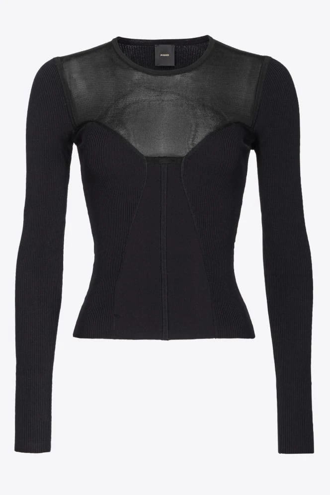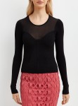 - Okrągły dekolt, długie rękawy i korpus o fasonie gorsetu, z prześwitującą wstawką w górnej części