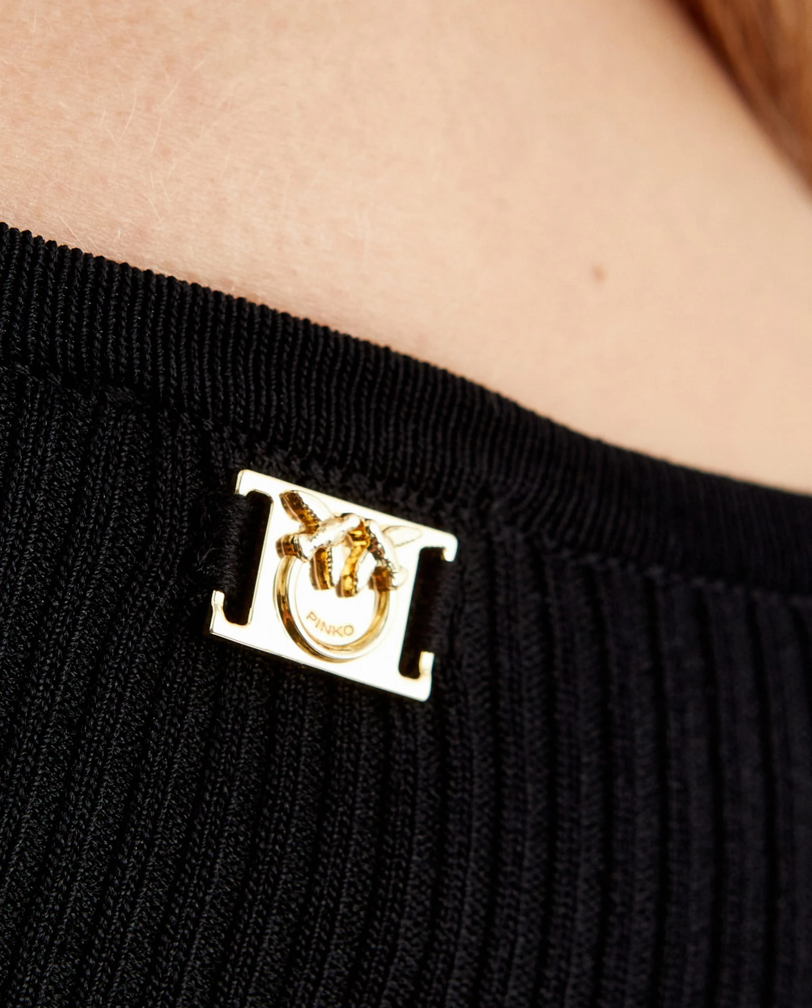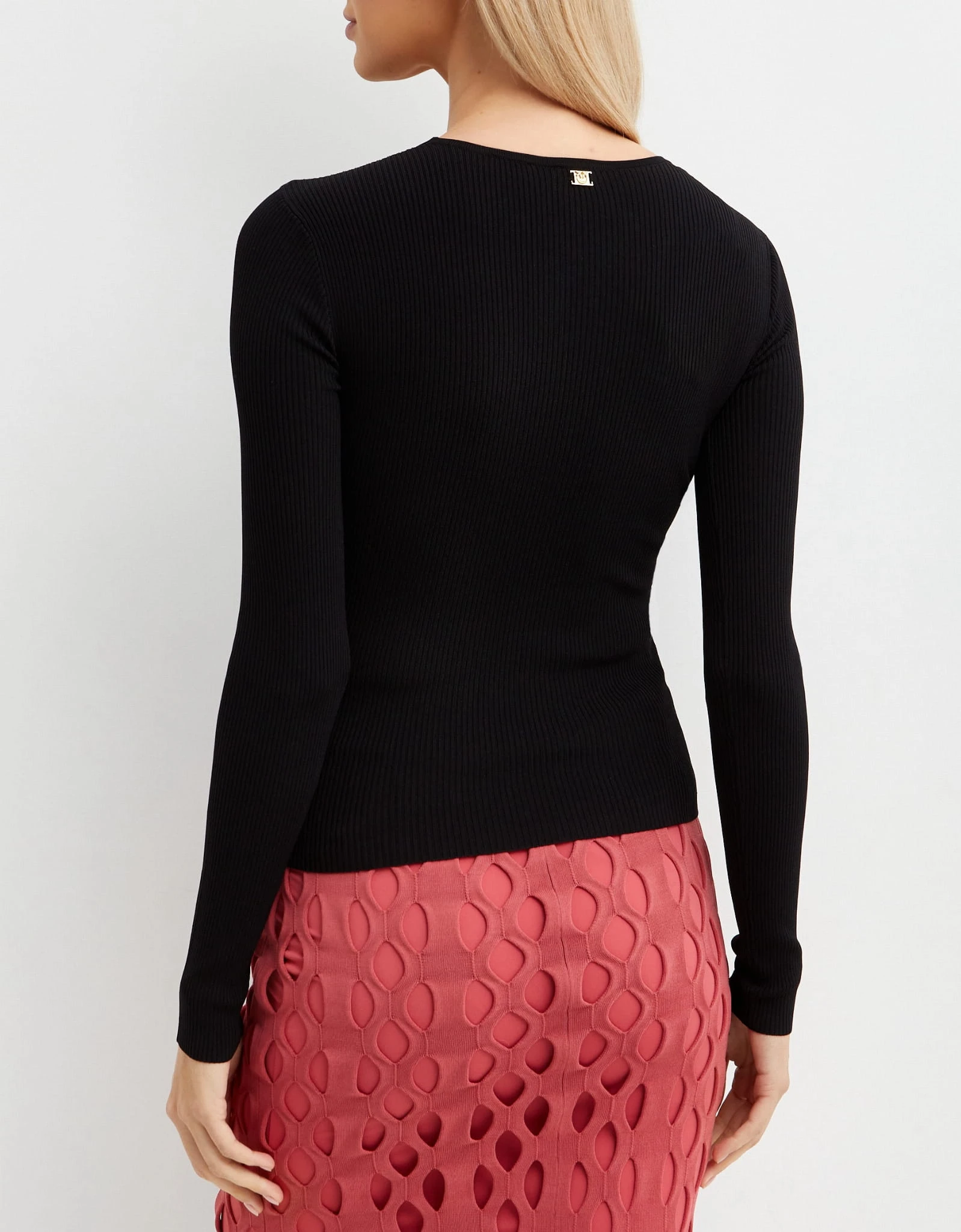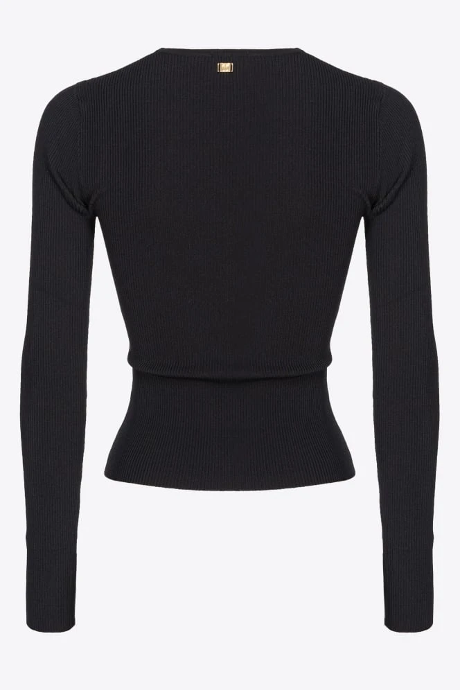 Czarny dopasowany top Criceto marki Pinko to elegancka i kobieca propozycja, która łączy klasyczny styl z subtelnymi, nowoczesnymi detalami. Ma długi rękaw i gorsetowy fason, który pięknie podkreśla sylwetkę, nadając jej smukłości. Okrągły dekolt sprawia, że top ma prostą, ale elegancką linię. Przezroczysta wstawka z przodu to interesujący detal, który dodaje topowi zmysłowości i wyróżnia go na tle innych klasycznych modeli. Wykonany z elastycznego materiału z dodatkiem wiskozy, top jest przyjemny w noszeniu i dopasowuje się do ciała, zapewniając komfort i styl.