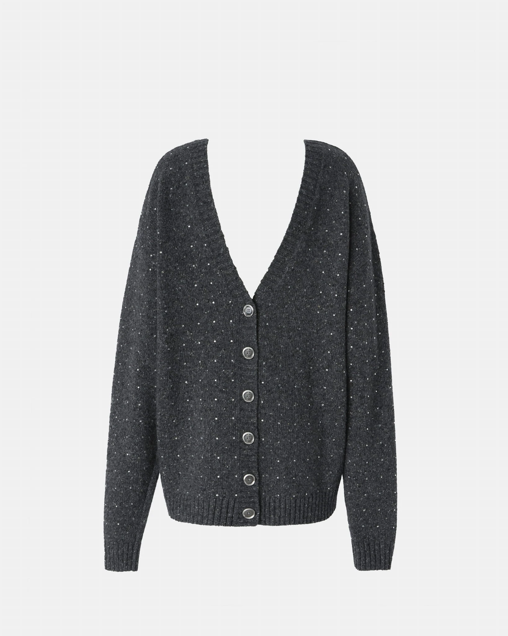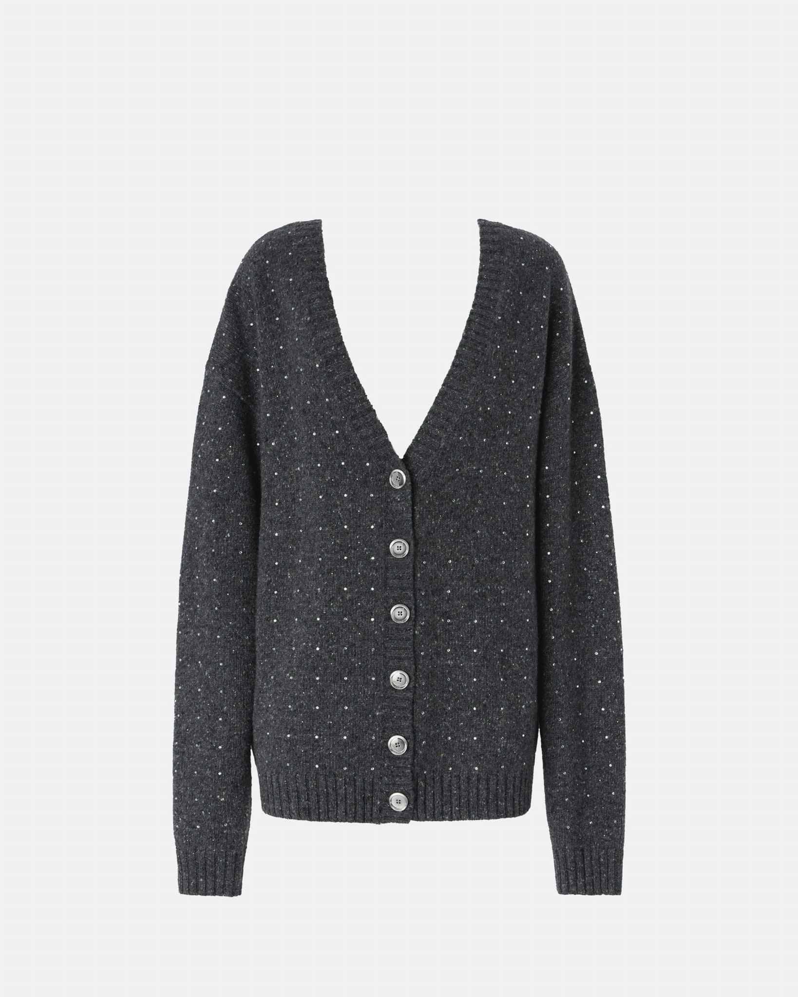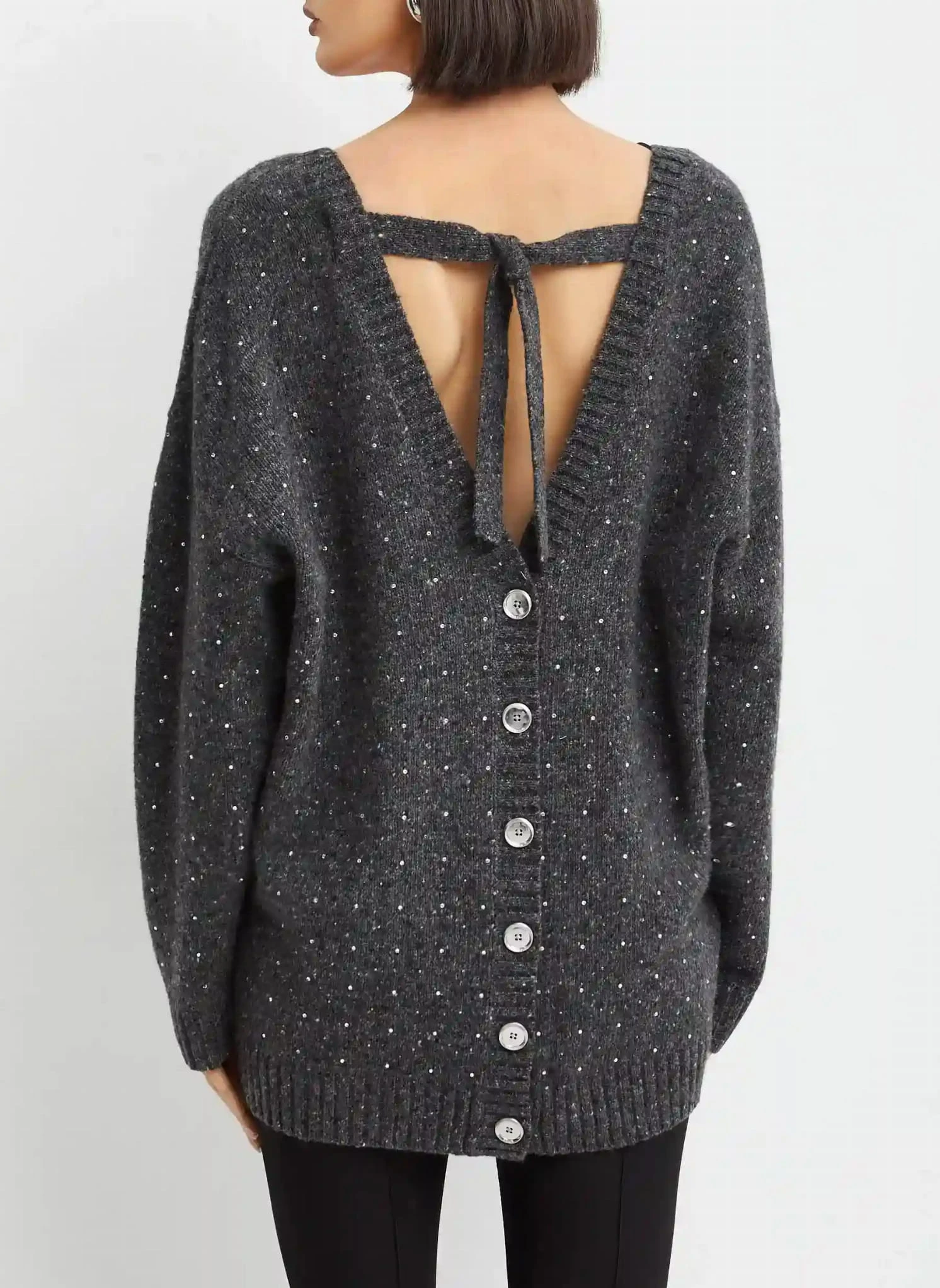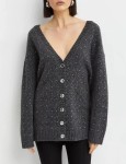 Kardigan projektu marki Pinko w kolorze szarym to elegancka i wyjątkowa propozycja, która przyciąga uwagę subtelnymi, ozdobnymi kryształkami na całej powierzchni. Głęboki dekolt z przodu oraz z tyłu nadaje mu odrobinę zmysłowości, łącząc elegancję z nowoczesnym stylem. Dwustronne zapięcie na guziki pozwala na swobodne dopasowanie kardiganu do różnych stylizacji. Brzegi wykończone prążkowanym ściągaczem dodają mu struktury i klasycznego wykończenia. To kardigan, który idealnie sprawdzi się zarówno w casualowych, jak i bardziej eleganckich zestawach, dodając blasku i szyku.