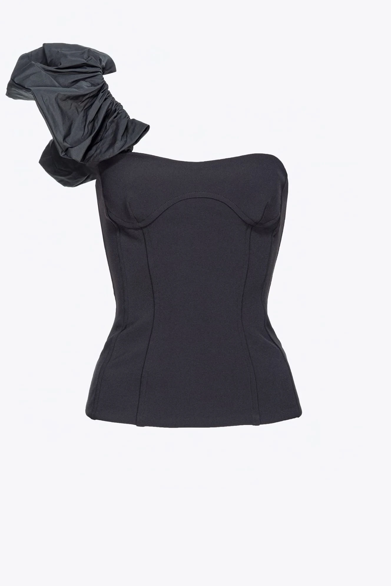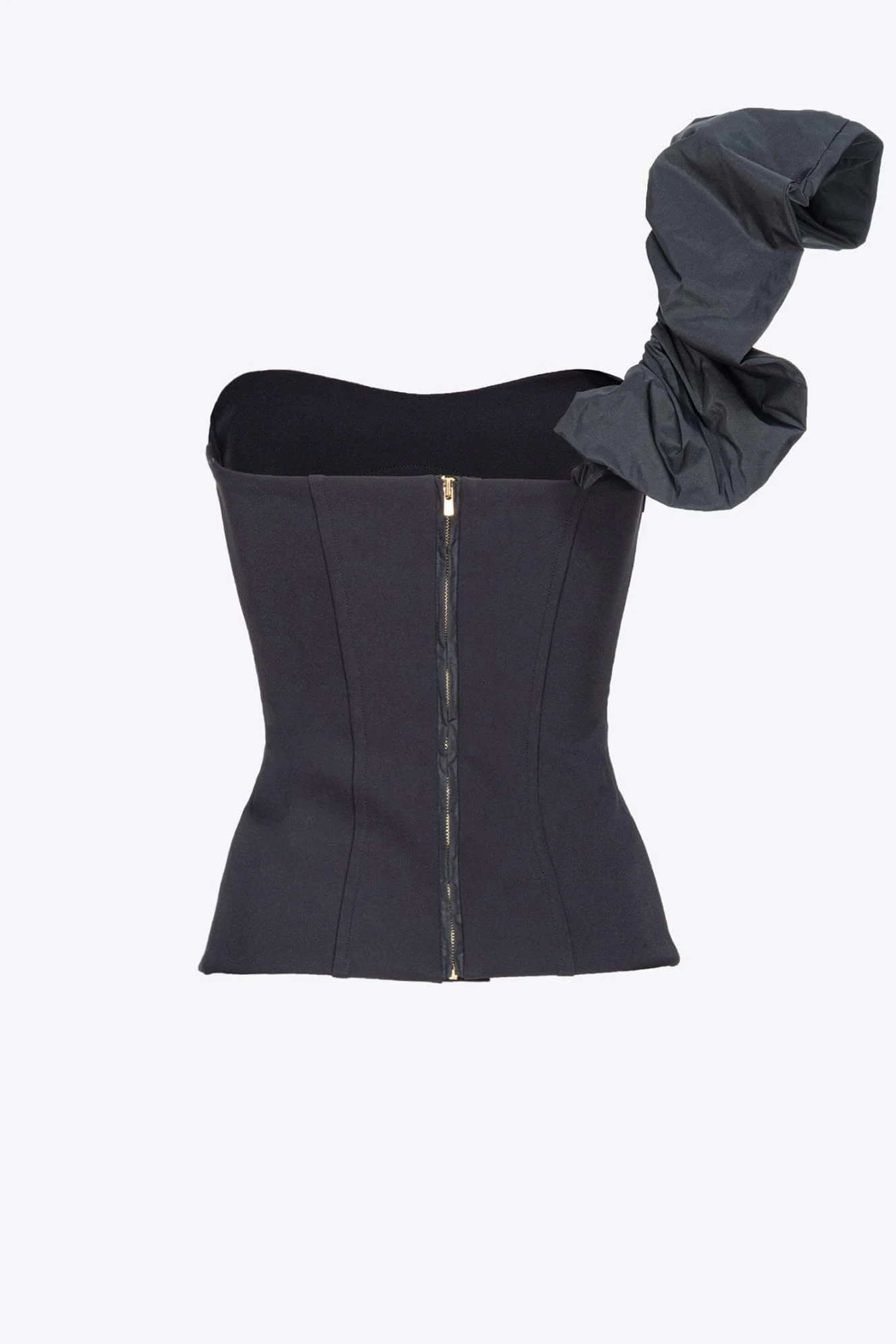 - Przylegająca linia na wysokości korpusu, ze stębnowaniami, ramiączka podszyte obszerną taftą, tworzącą dramatyczny efekt