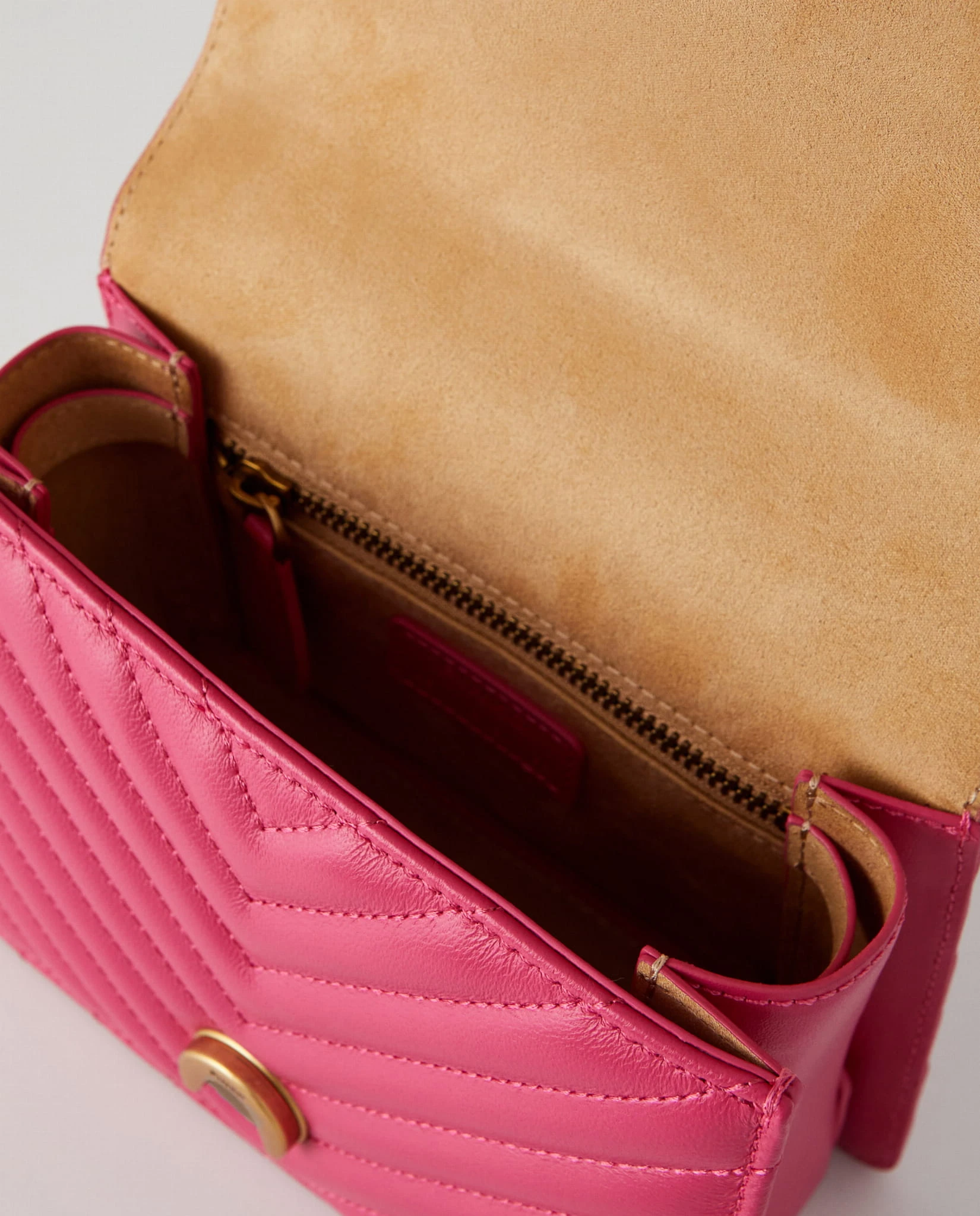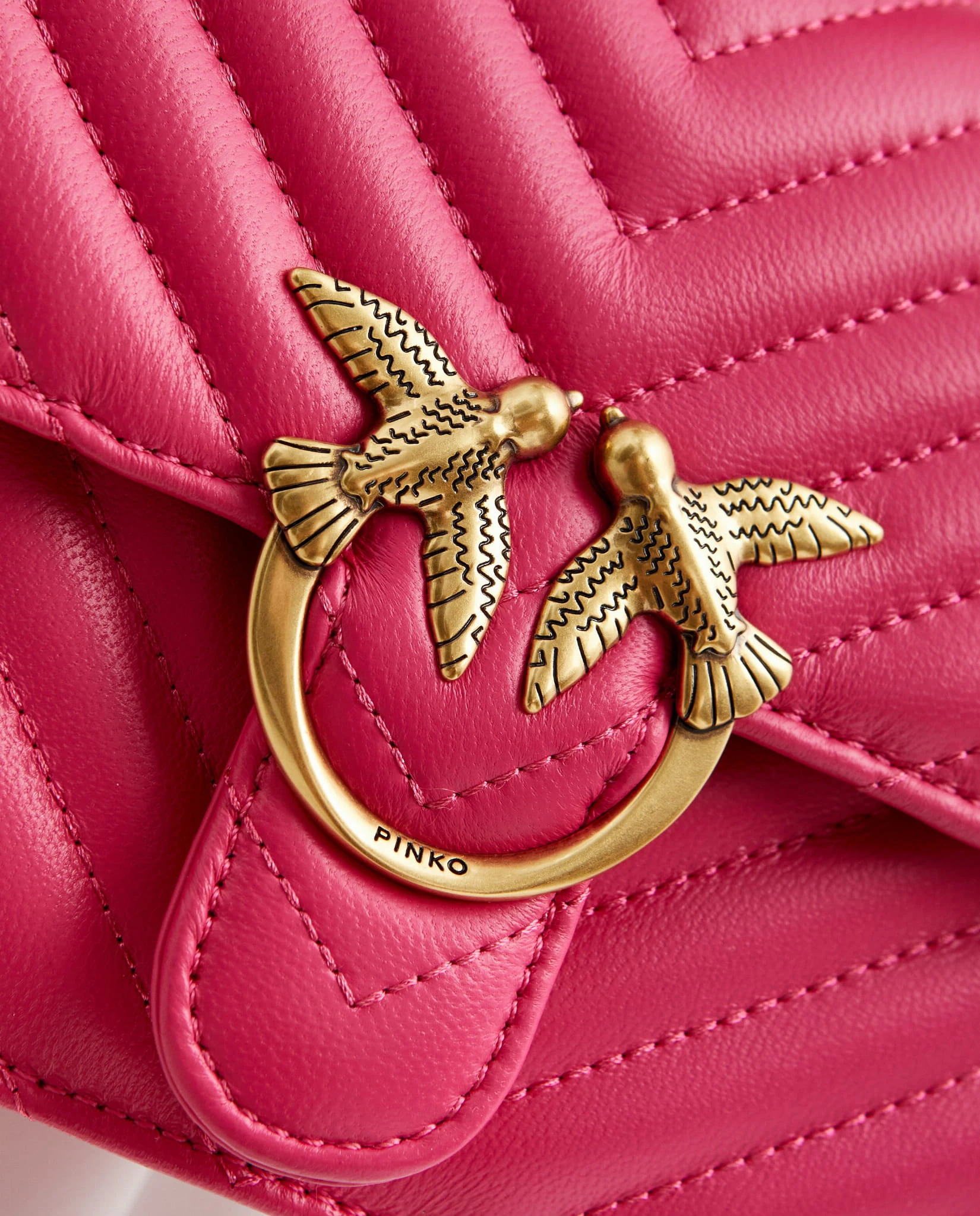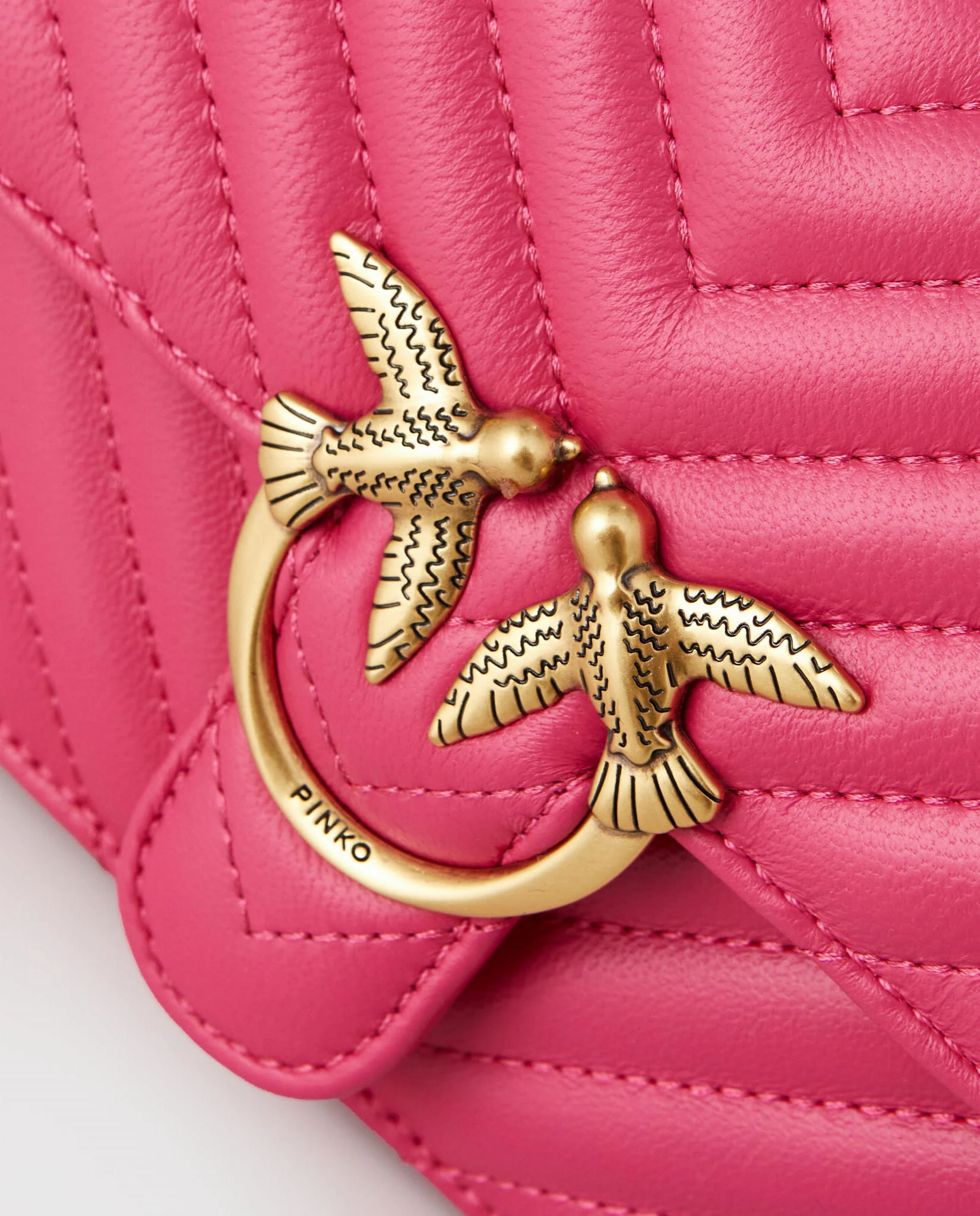 Torebka Lady Big Puff Chevron marki Pinko w kolorze fuksji to wyjątkowy model wykonany z wysokiej jakości miękkiej skóry nappa ze skośnym pikowaniem. Złote metalowe detale i logo Love Birds na klapie dodają jej elegancji. Torebka jest zamykana na metalowy zatrzask i wyposażona w rączkę oraz długi pasek, co pozwala nosić ją na ramieniu lub w ręce. Wnętrze podzielone jest na dwie komory, rozdzielone kieszenią zapinaną na suwak. W zestawie znajduje się worek do przechowywania – idealna torebka na codzienne stylizacje!