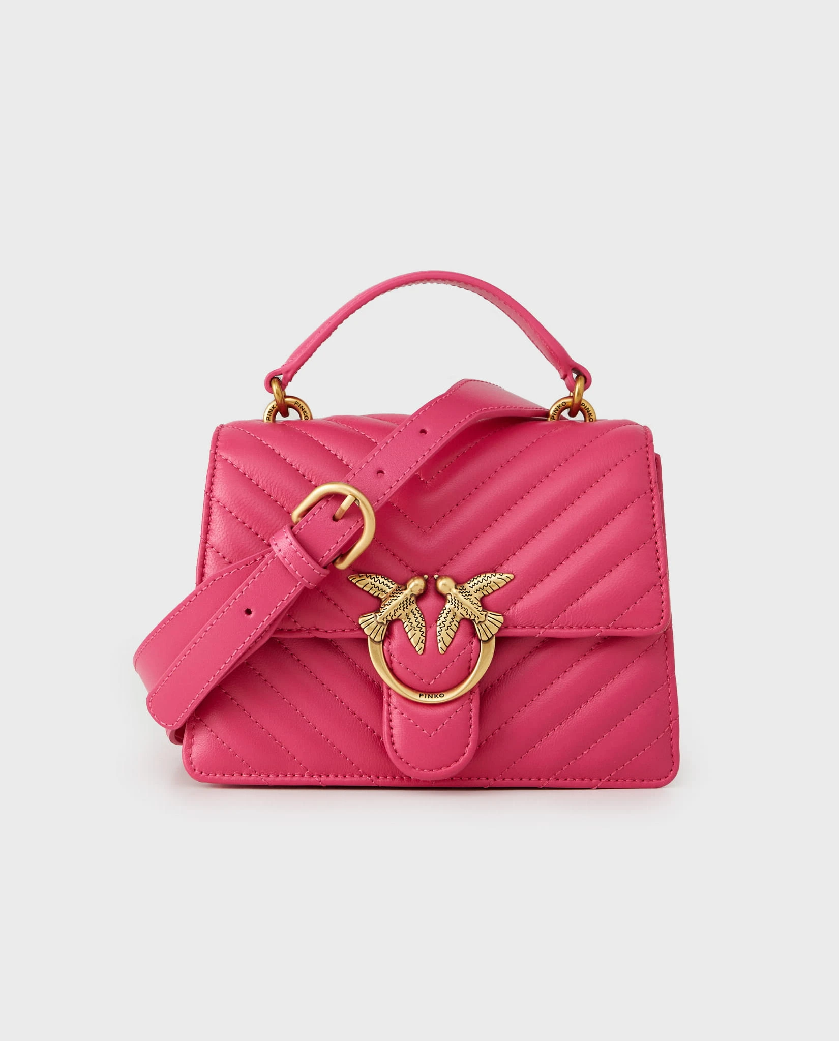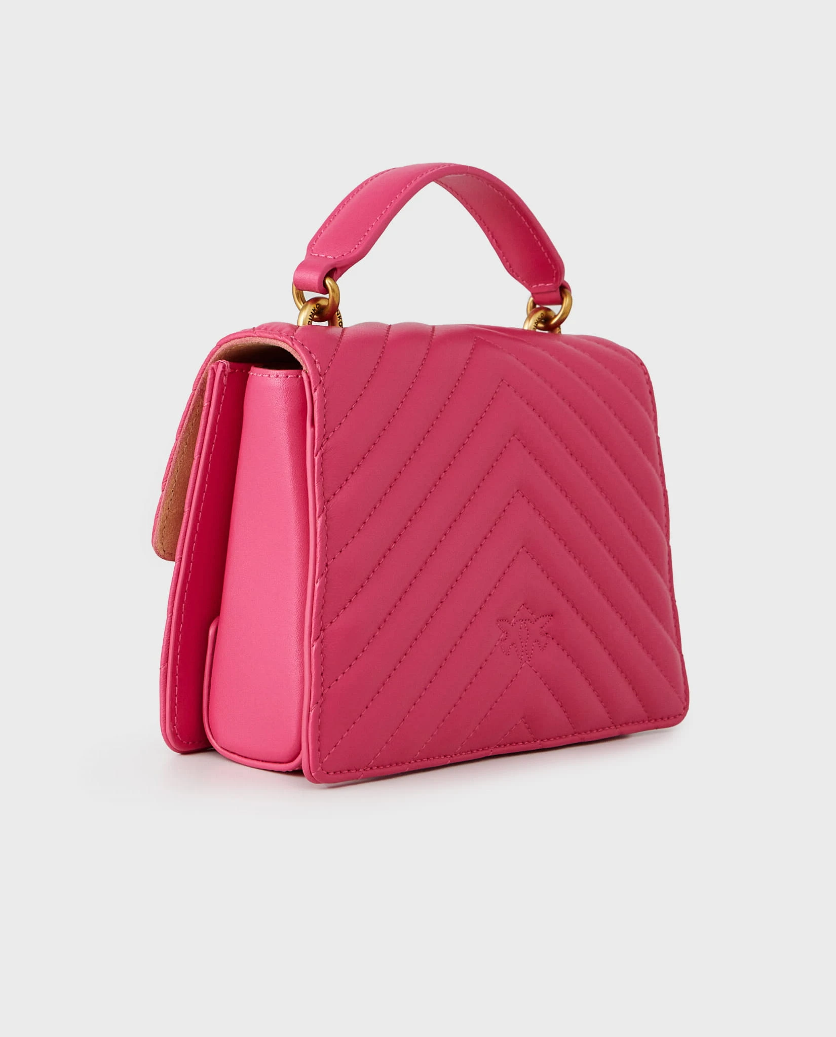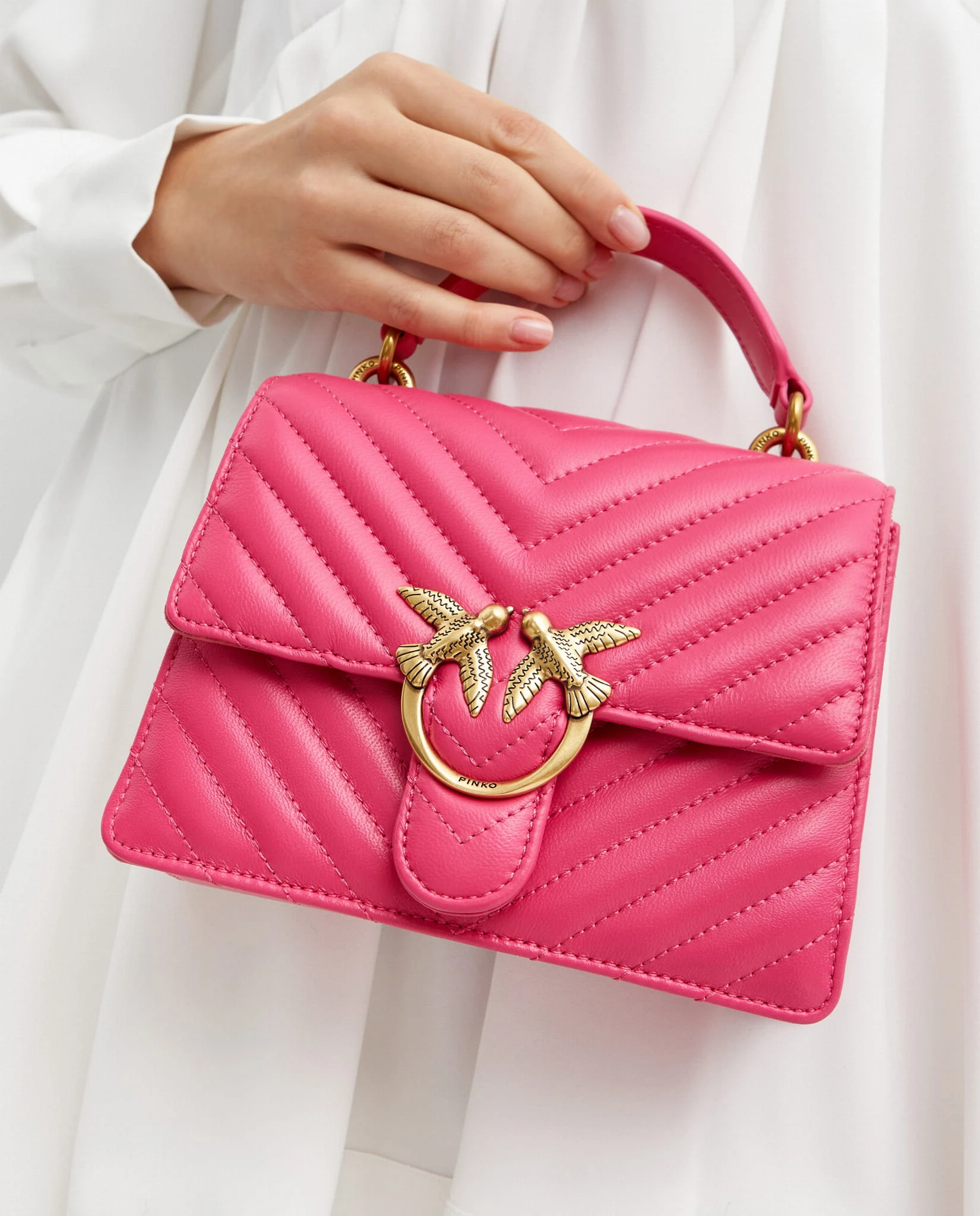 Torebka Lady Big Puff Chevron marki Pinko w kolorze fuksji to wyjątkowy model wykonany z wysokiej jakości miękkiej skóry nappa ze skośnym pikowaniem. Złote metalowe detale i logo Love Birds na klapie dodają jej elegancji. Torebka jest zamykana na metalowy zatrzask i wyposażona w rączkę oraz długi pasek, co pozwala nosić ją na ramieniu lub w ręce. Wnętrze podzielone jest na dwie komory, rozdzielone kieszenią zapinaną na suwak. W zestawie znajduje się worek do przechowywania – idealna torebka na codzienne stylizacje!