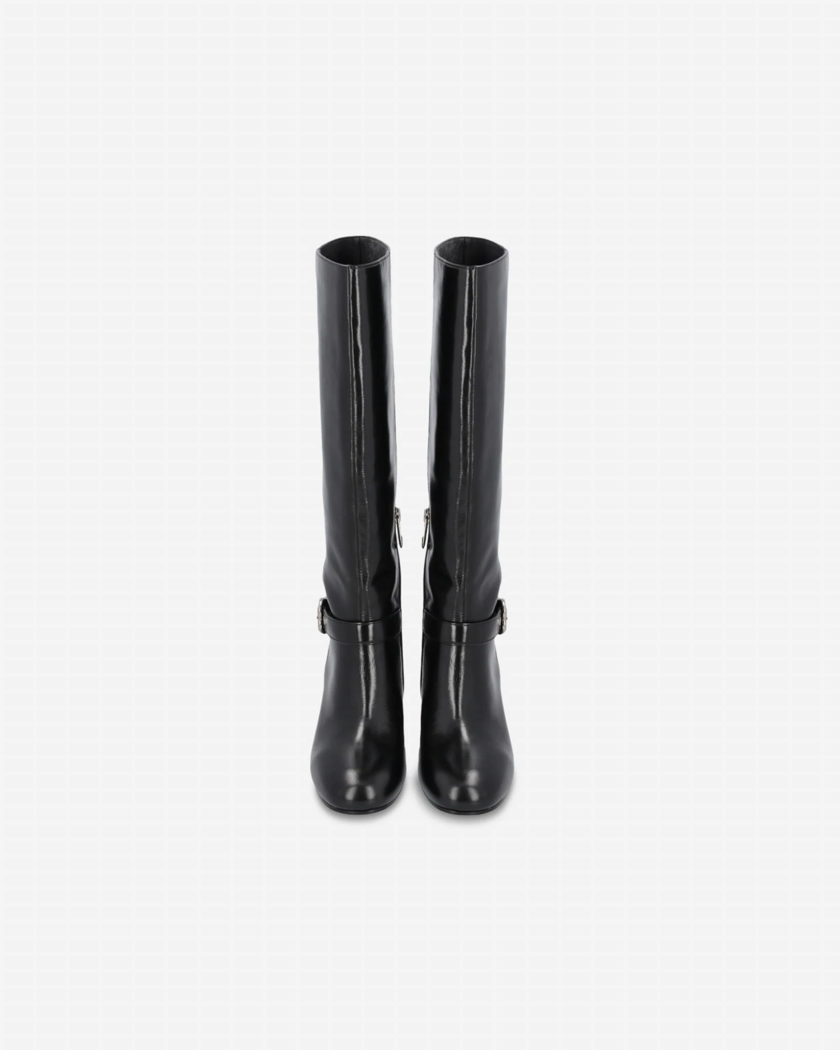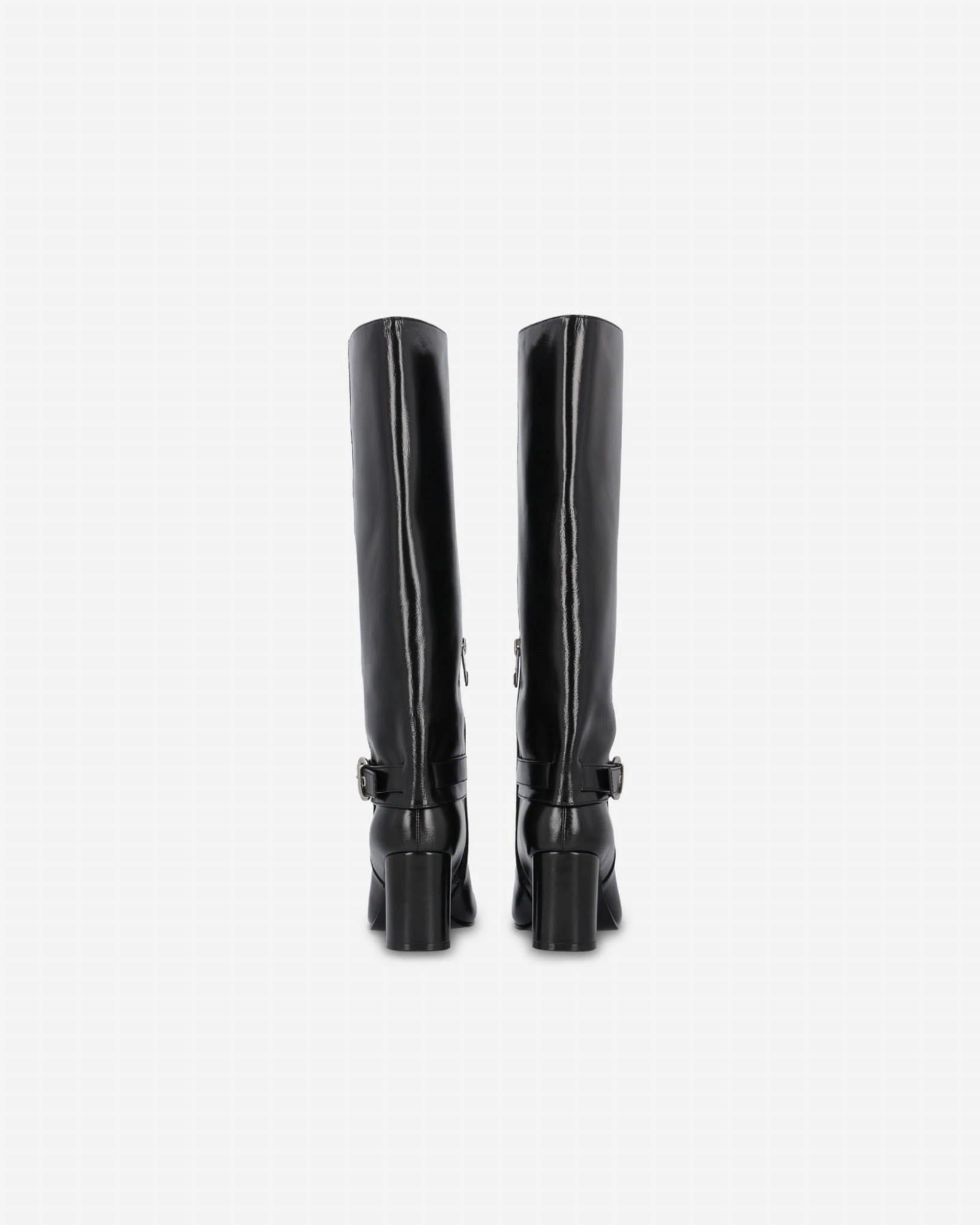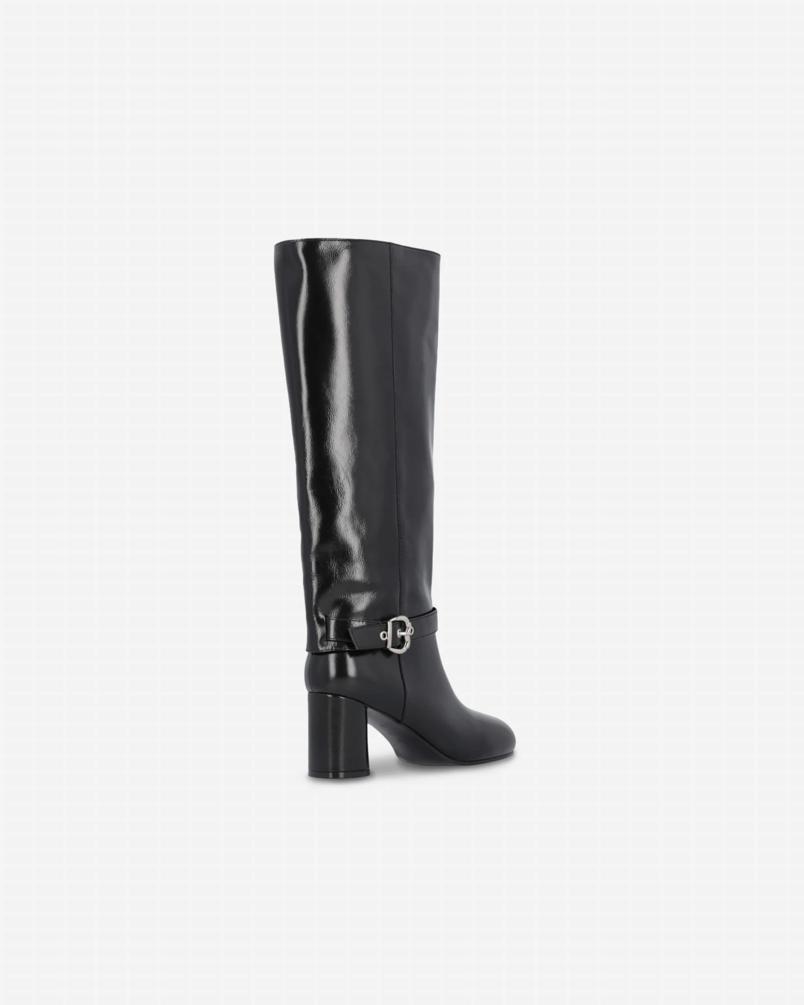 Kozaki marki Pinko w kolorze czarnym, sięgające do kolan. Mają zaokrąglone noski oraz ozdobne paski z przodu, z metalową klamrą w kształcie serca, która dodaje im eleganckiego akcentu. Podeszwa z tuniskóry, a kwadratowy obcas o wysokości 7 cm zapewnia wygodę i stabilność. Stylowe i funkcjonalne, idealne na chłodniejsze dni.