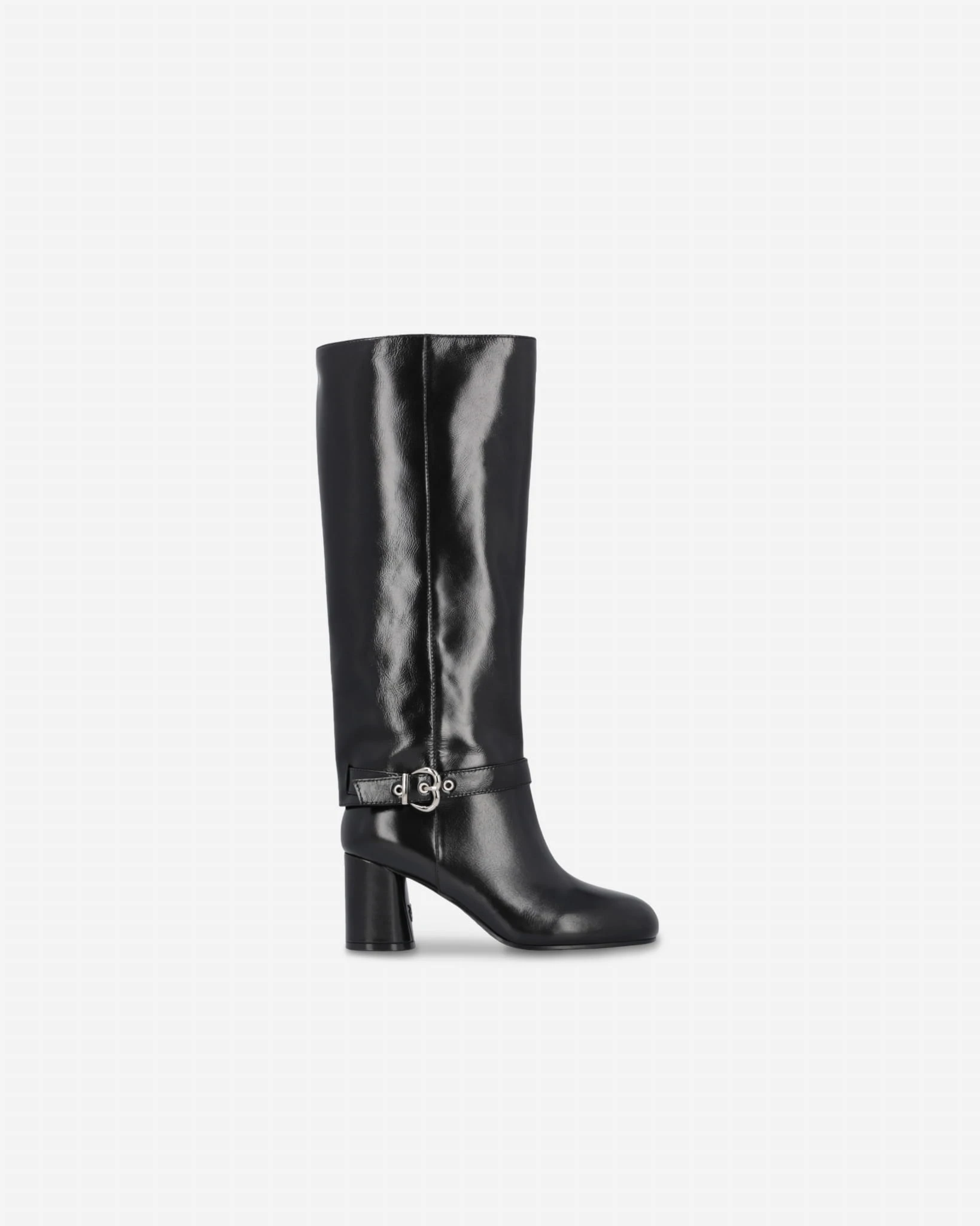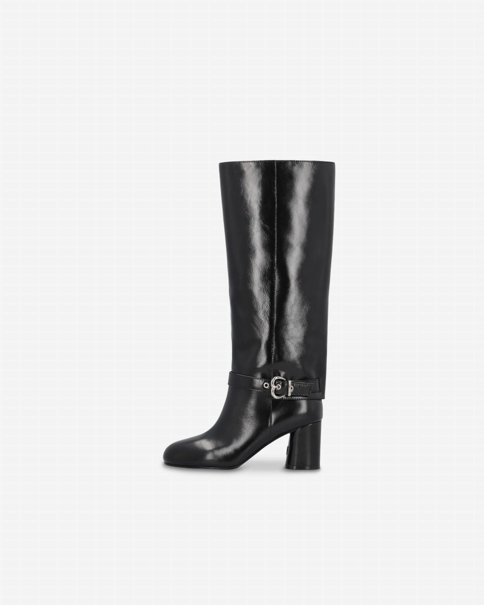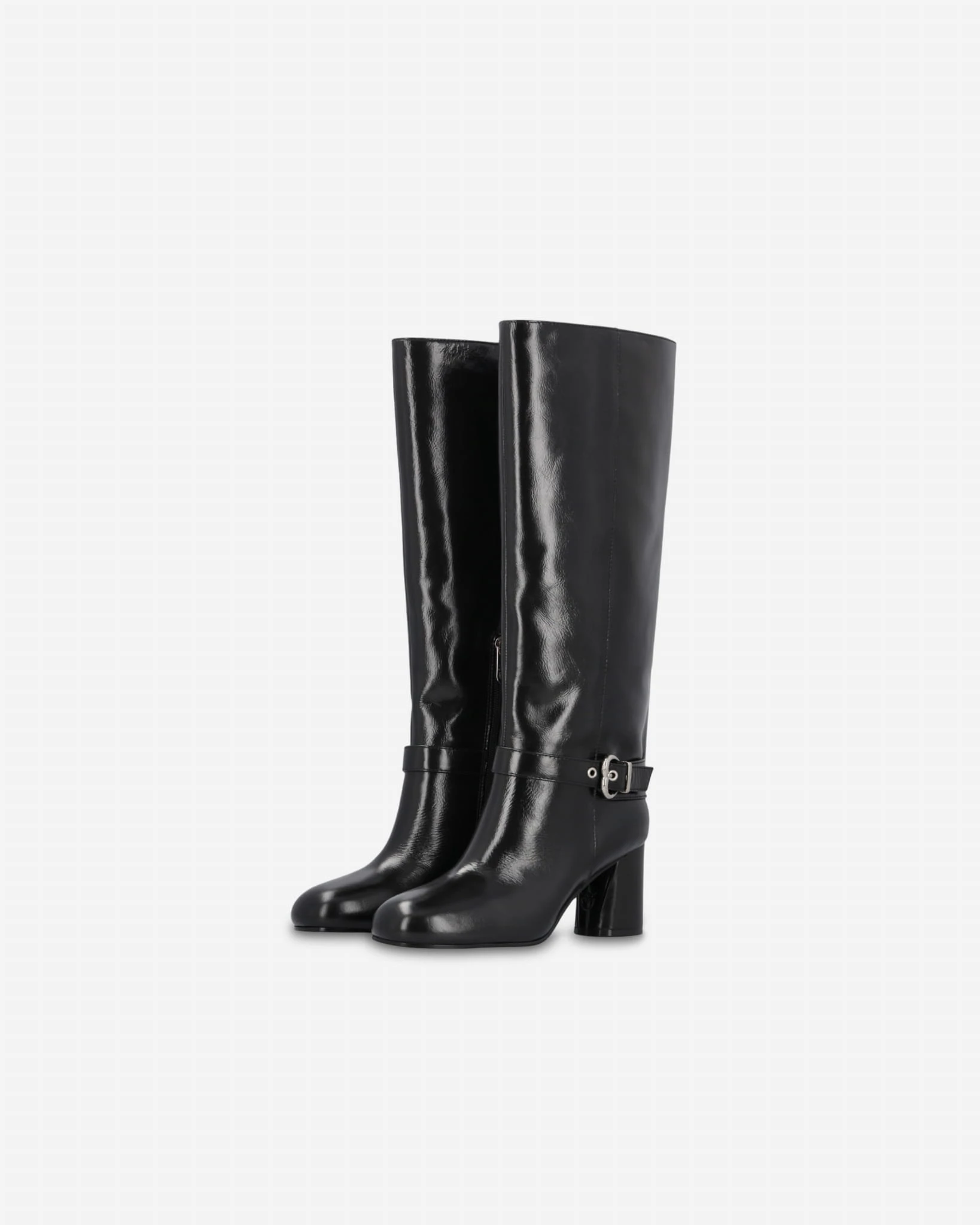 Kozaki marki Pinko w kolorze czarnym, sięgające do kolan. Mają zaokrąglone noski oraz ozdobne paski z przodu, z metalową klamrą w kształcie serca, która dodaje im eleganckiego akcentu. Podeszwa z tuniskóry, a kwadratowy obcas o wysokości 7 cm zapewnia wygodę i stabilność. Stylowe i funkcjonalne, idealne na chłodniejsze dni.