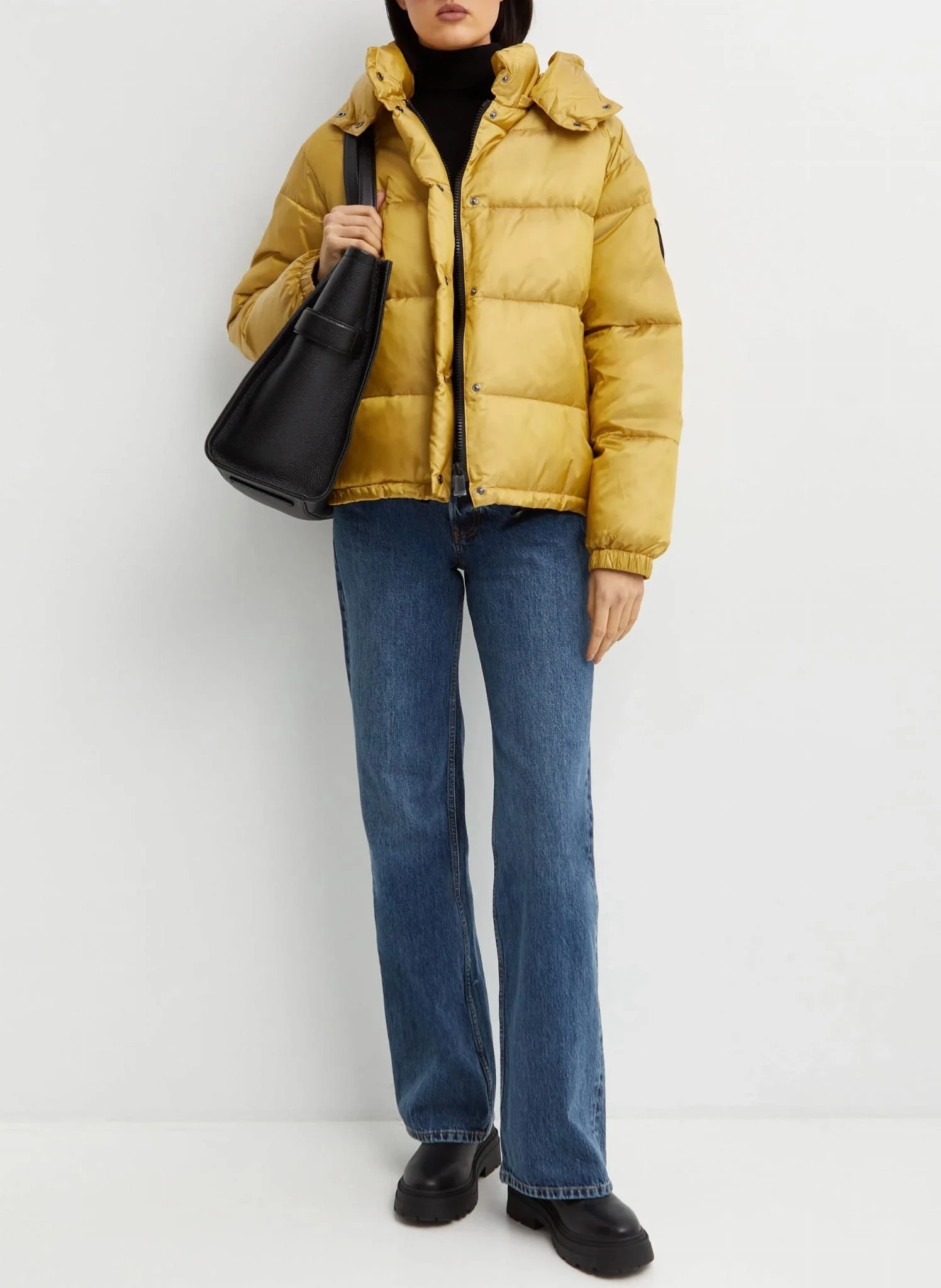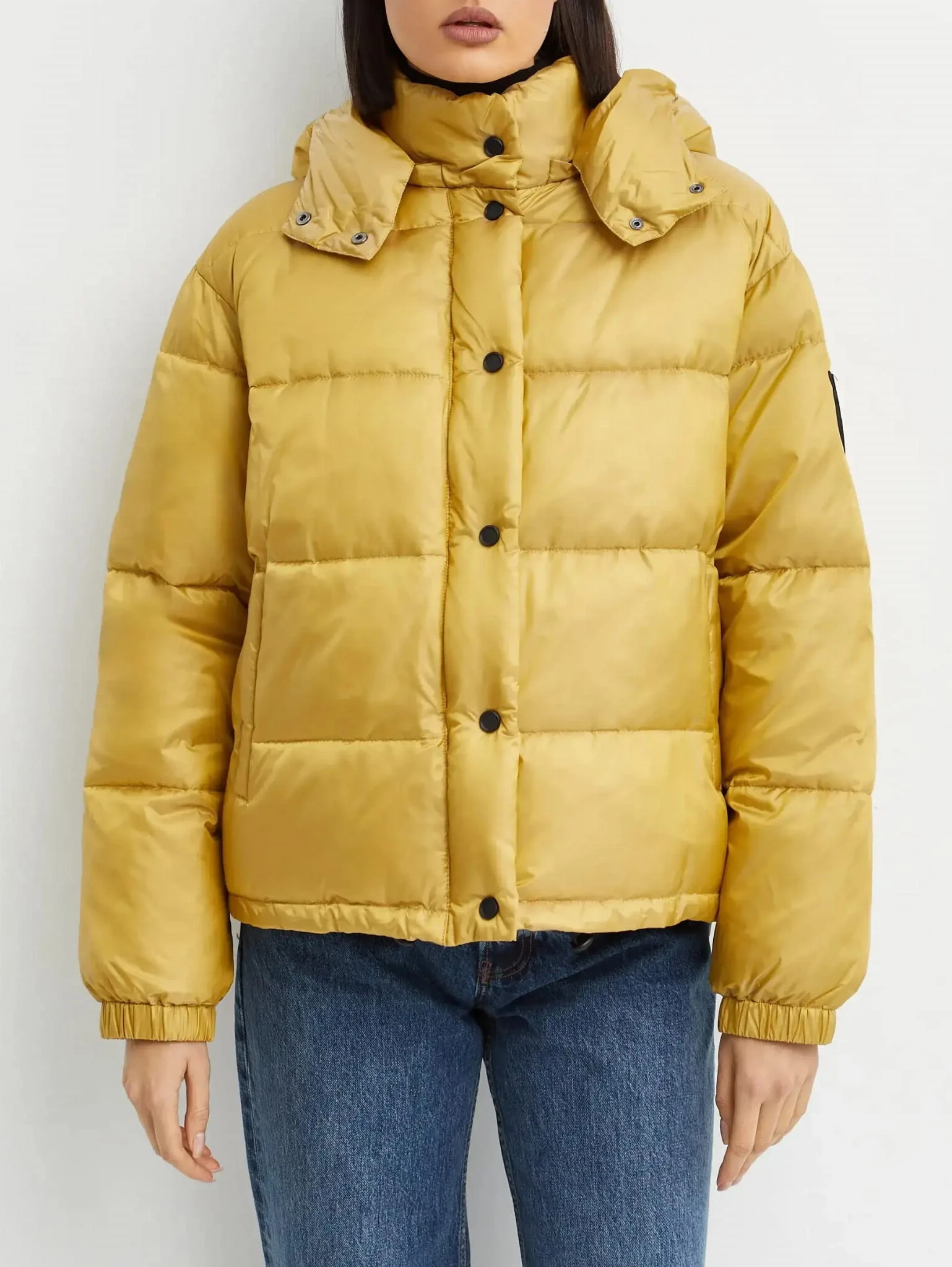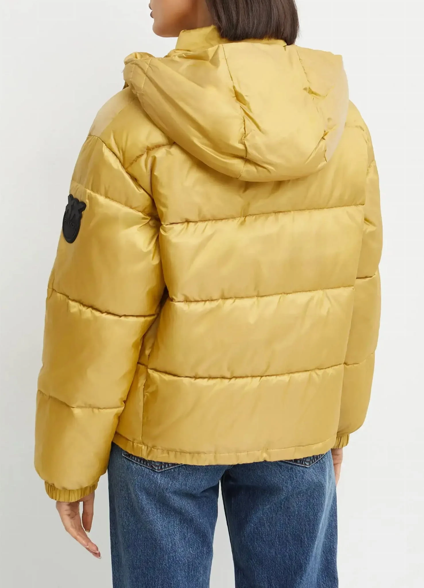 Kurtka puchowa marki Pinko w kolorze żółtym o krótkim kroju. Zapinana na zamek błyskawiczny, z odpinanym kapturem i bocznymi kieszeniami na suwak. Wyściełane boczne logo z naszywką w kolorze czarnym. Modna i funkcjonalna, idealna na chłodniejsze dni.