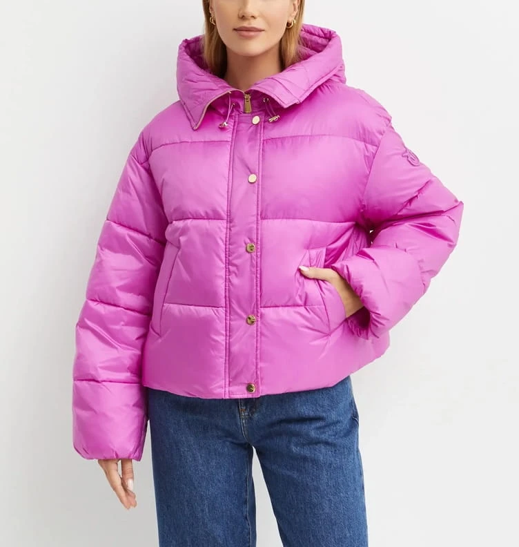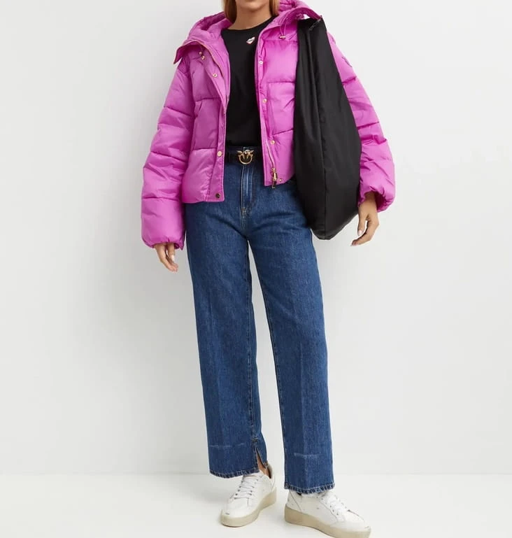 Krótka kurtka projektu włoskiej marki Pinko w subtelnym odcieniu różu. Model wyposażony w duży, otulający kaptur, zapinany na eleganckie metalowe zatrzaski, łączy wygodę z nowoczesnym fasonem. Modowa propozycja do miejskich stylizacji w chłodniejsze dni. Poczujesz się jak na wybiegu w Mediolanie!