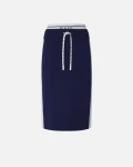 Ołówkowa linia pięknie podkreśla sylwetkę, a kontrastowa boczna taśma dodaje jej sportowego charakteru. W pasie znajdziesz elastyczną wstawkę, imitującą efekt bielizny noszonej pod spodem, ozdobioną logo PINKO i troczkiem do regulacji, dzięki czemu możesz idealnie dopasować spódnicę do swojej talii.