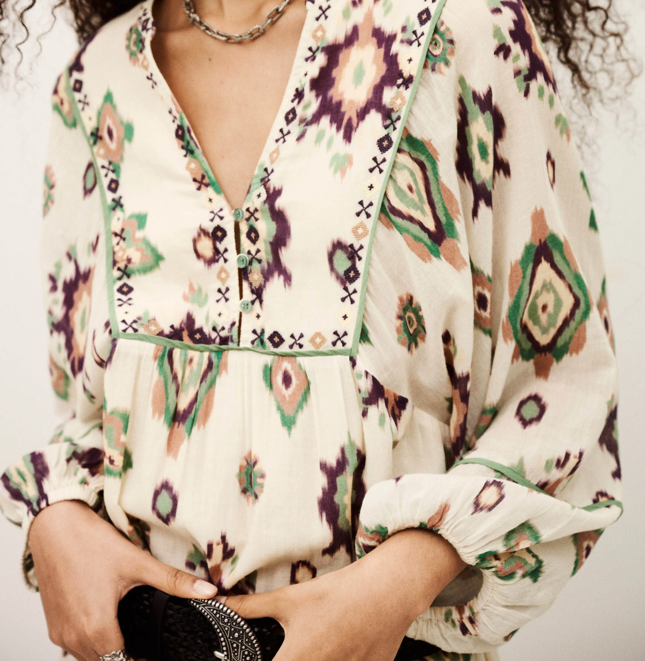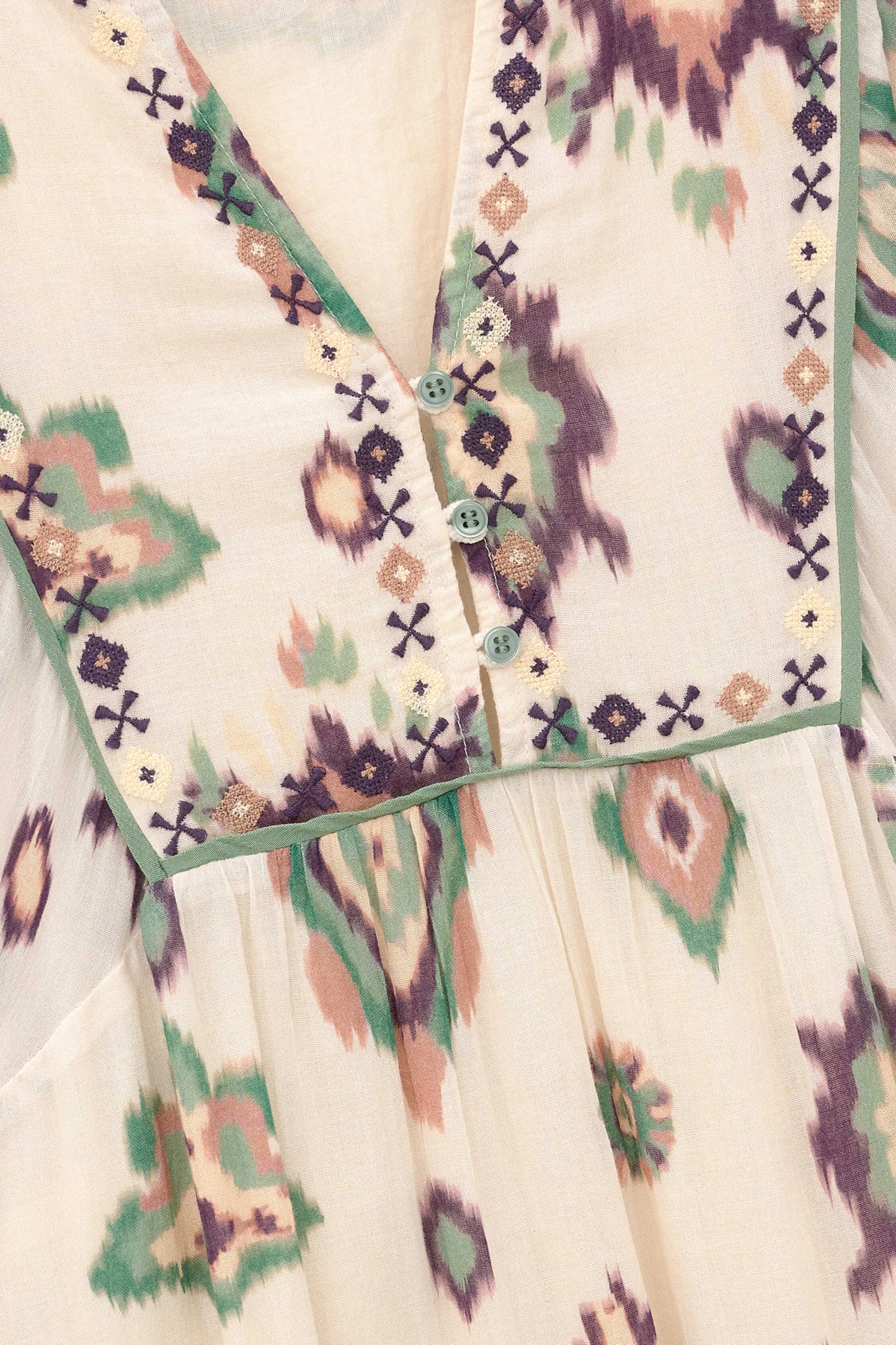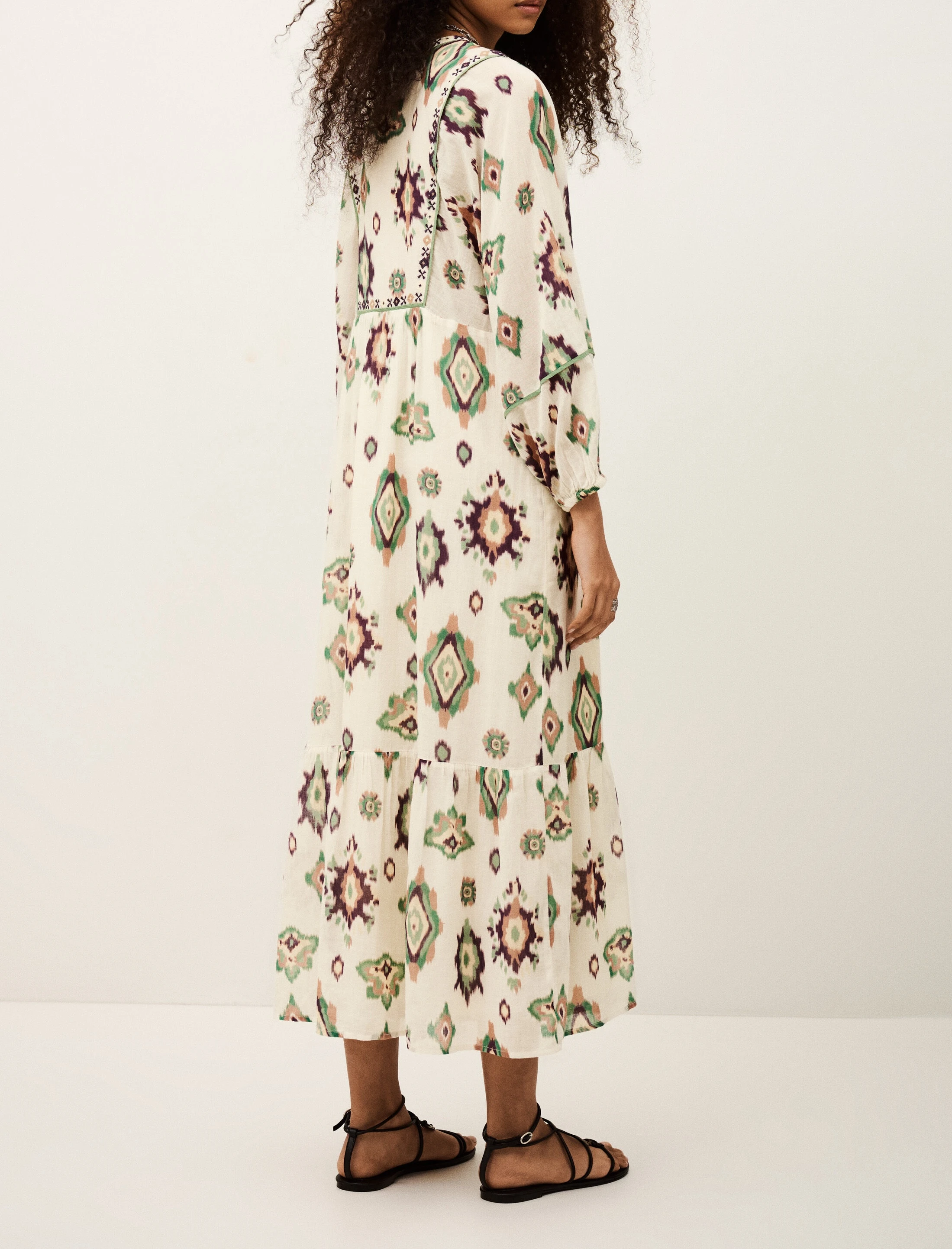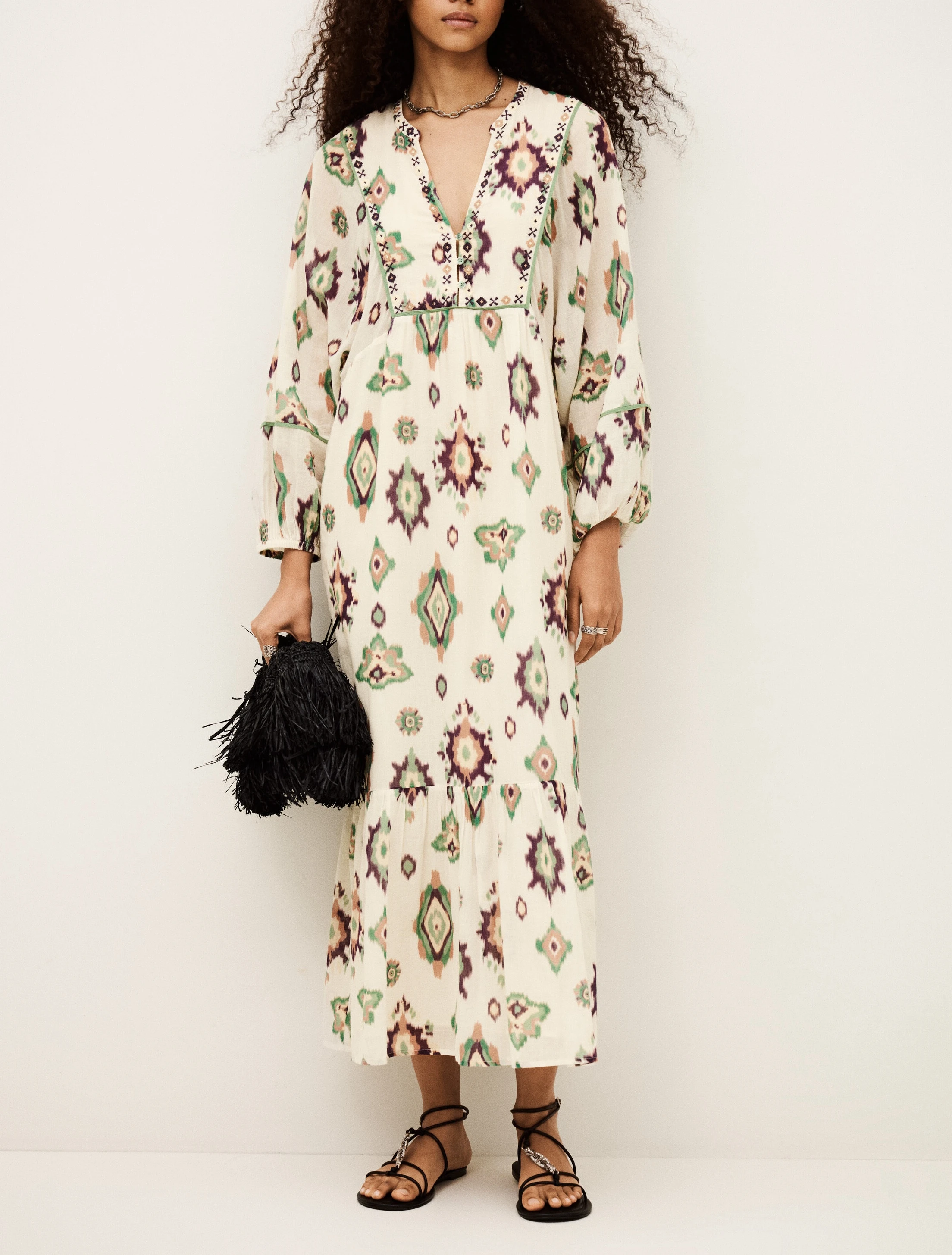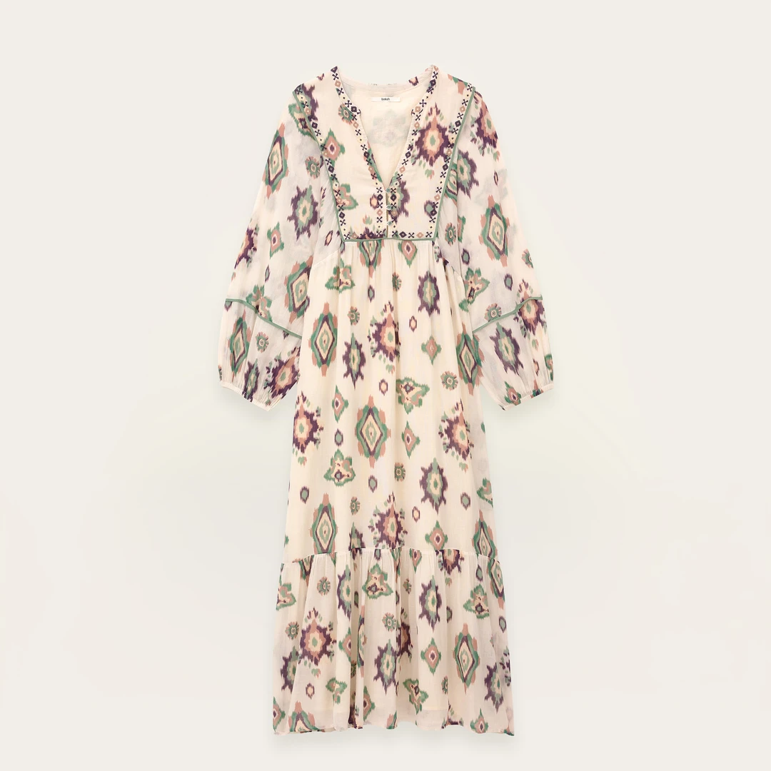 Swobodna, komfortowa sukienka o wydłużonej długości, łącząca prostotę z dekoracyjnymi detalami.