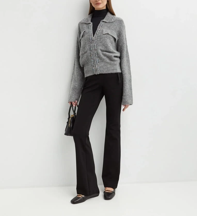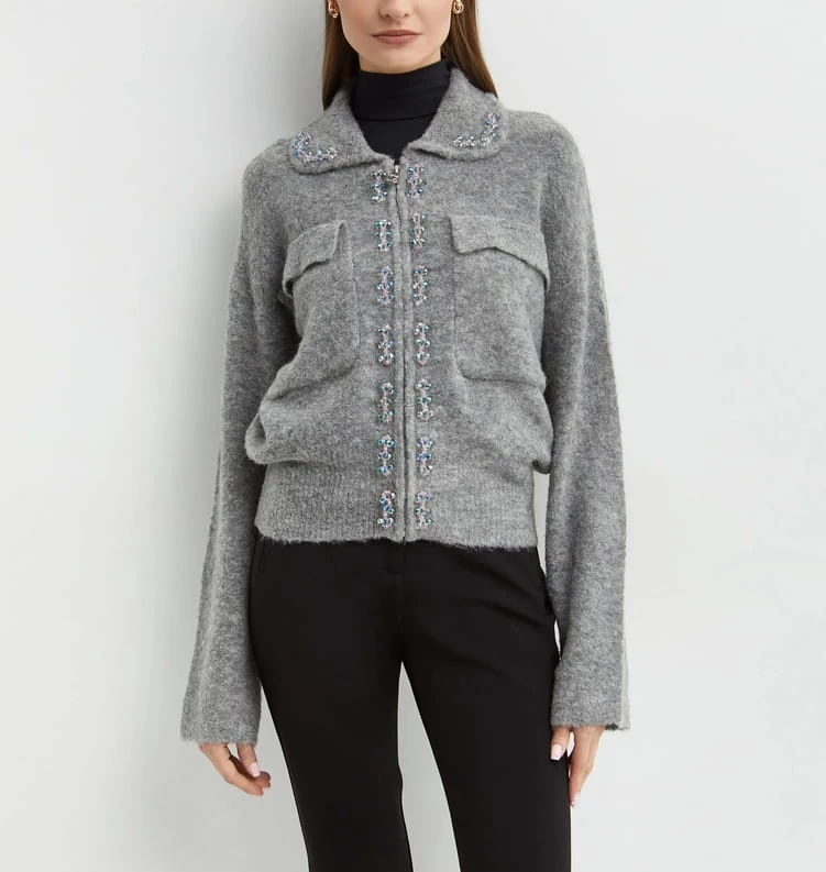 Kurtka marki Pinko w kolorze szarym, zdobiona efektownymi kamieniami. Wyposażona w praktyczne kieszenie z klapami oraz zapięcie na zamek błyskawiczny. Wyprodukowana we Włoszech, stanowi eleganckie i nowoczesne uzupełnienie garderoby.