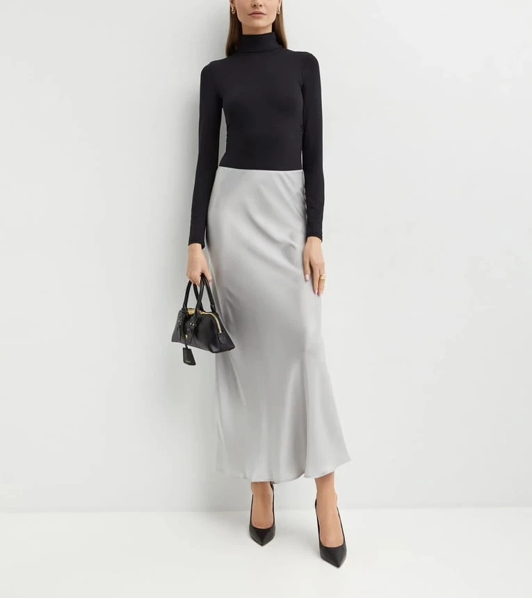 Wykonana z połyskującej satyny w odcieniu szarości, pięknie układa się na sylwetce, podkreślając jej lekkość i ruch.