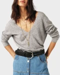 Sweter Pull Sollene marki BA&SH w kolorze szarym, wykonany z miękkiej mieszanki wełny. Posiada głęboki dekolt, który nadaje mu kobiecego i zmysłowego charakteru, idealnego do codziennych i eleganckich stylizacji.