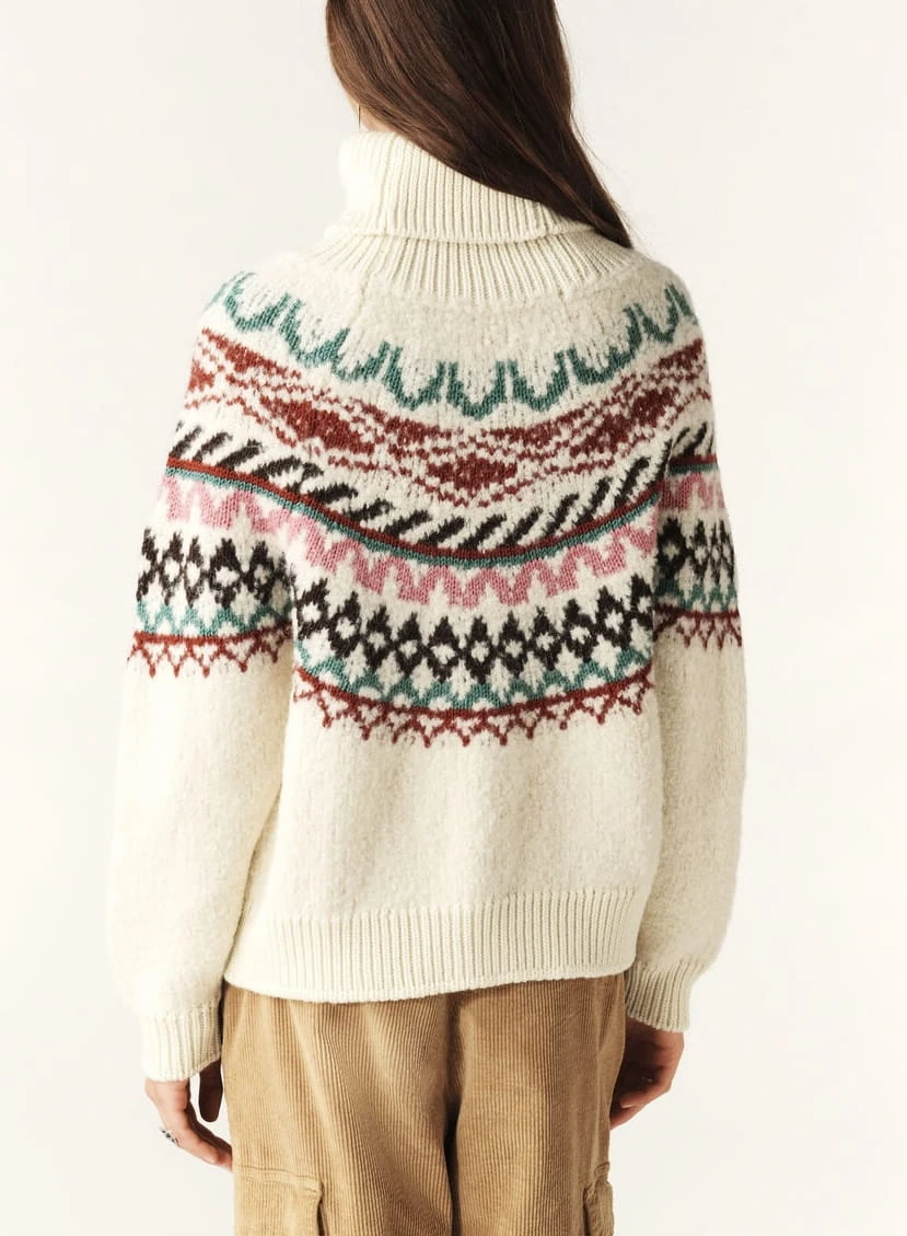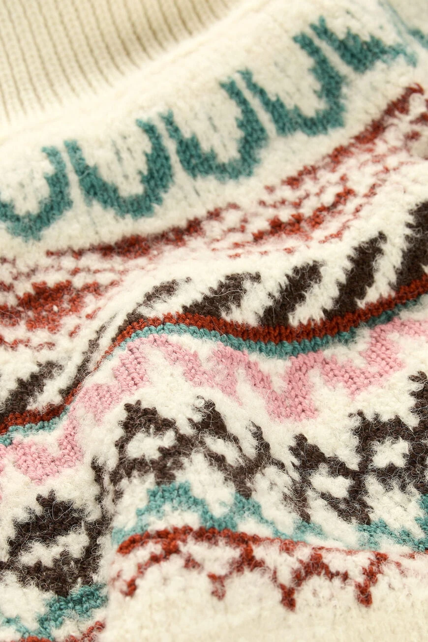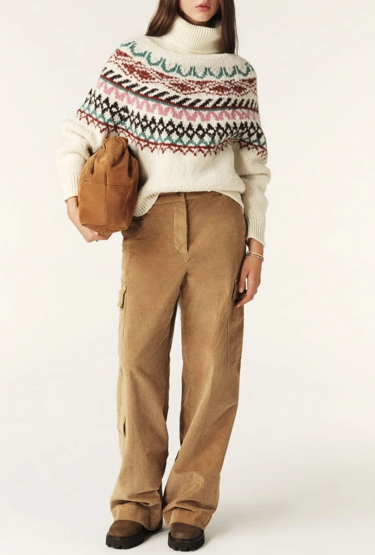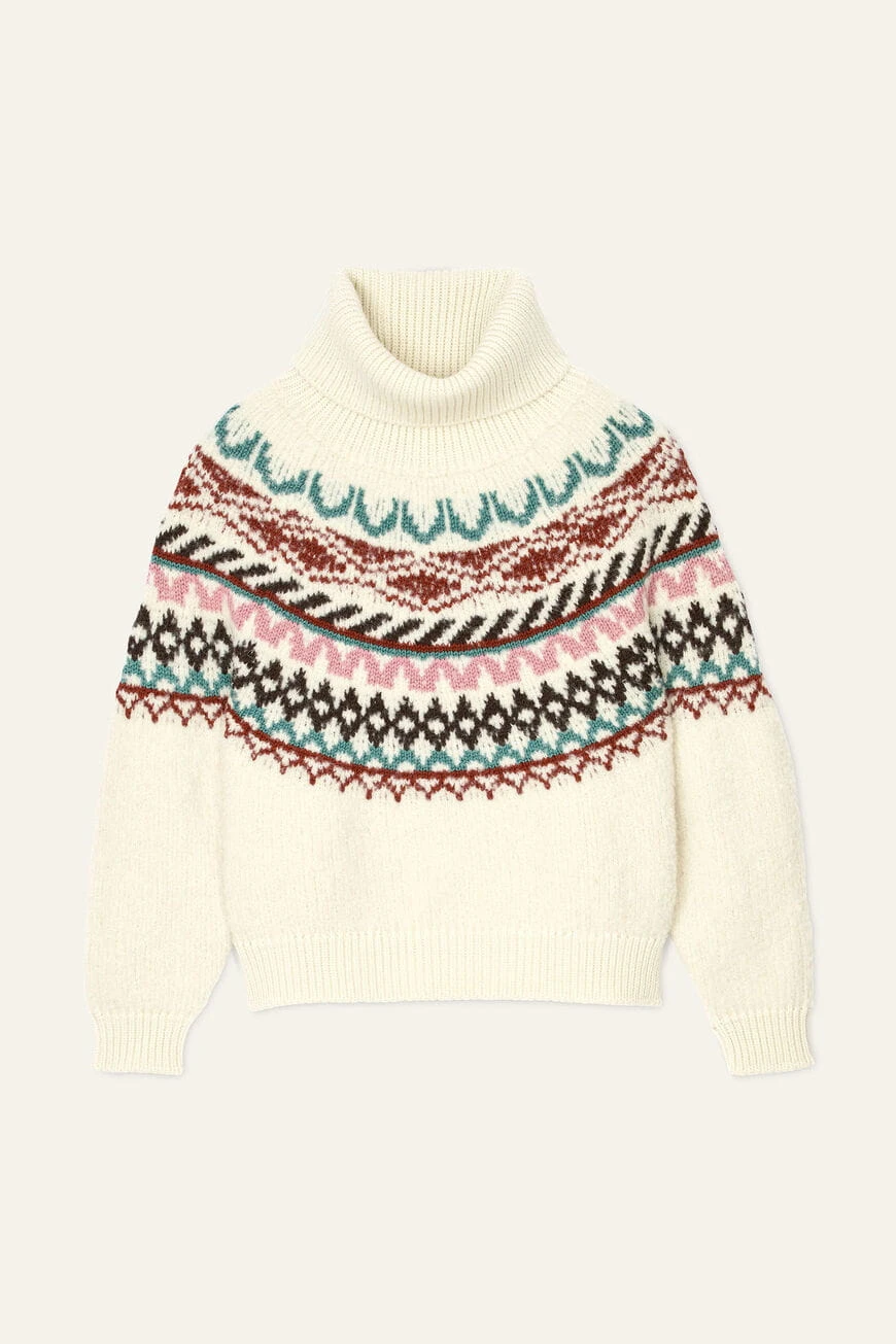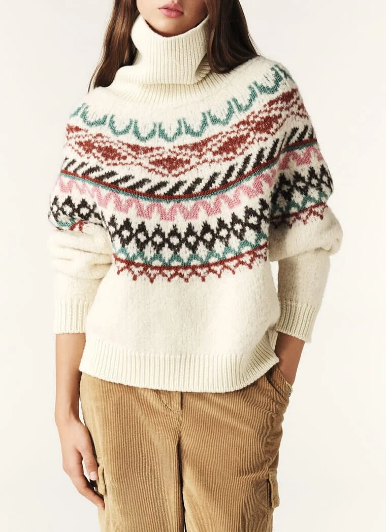 Sweter marki ba&sh w kolorze ecru, z miękkim i przyjemnym golfem. Ozdobne wzory oraz oversizowy krój nadają mu swobodny, ale stylowy charakter. Wyprodukowany we Włoszech, łączy komfort z elegancją, idealny na chłodniejsze dni.