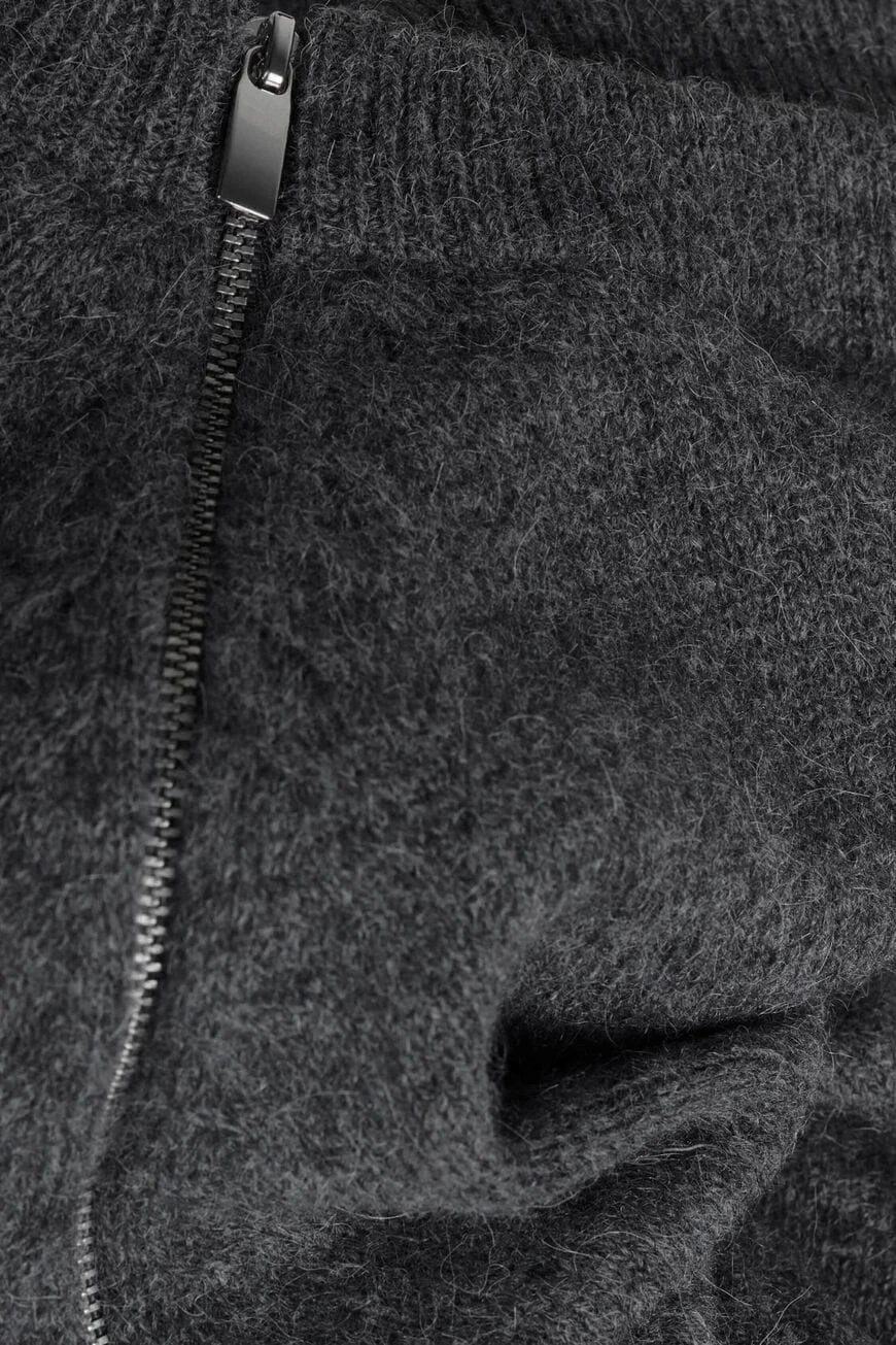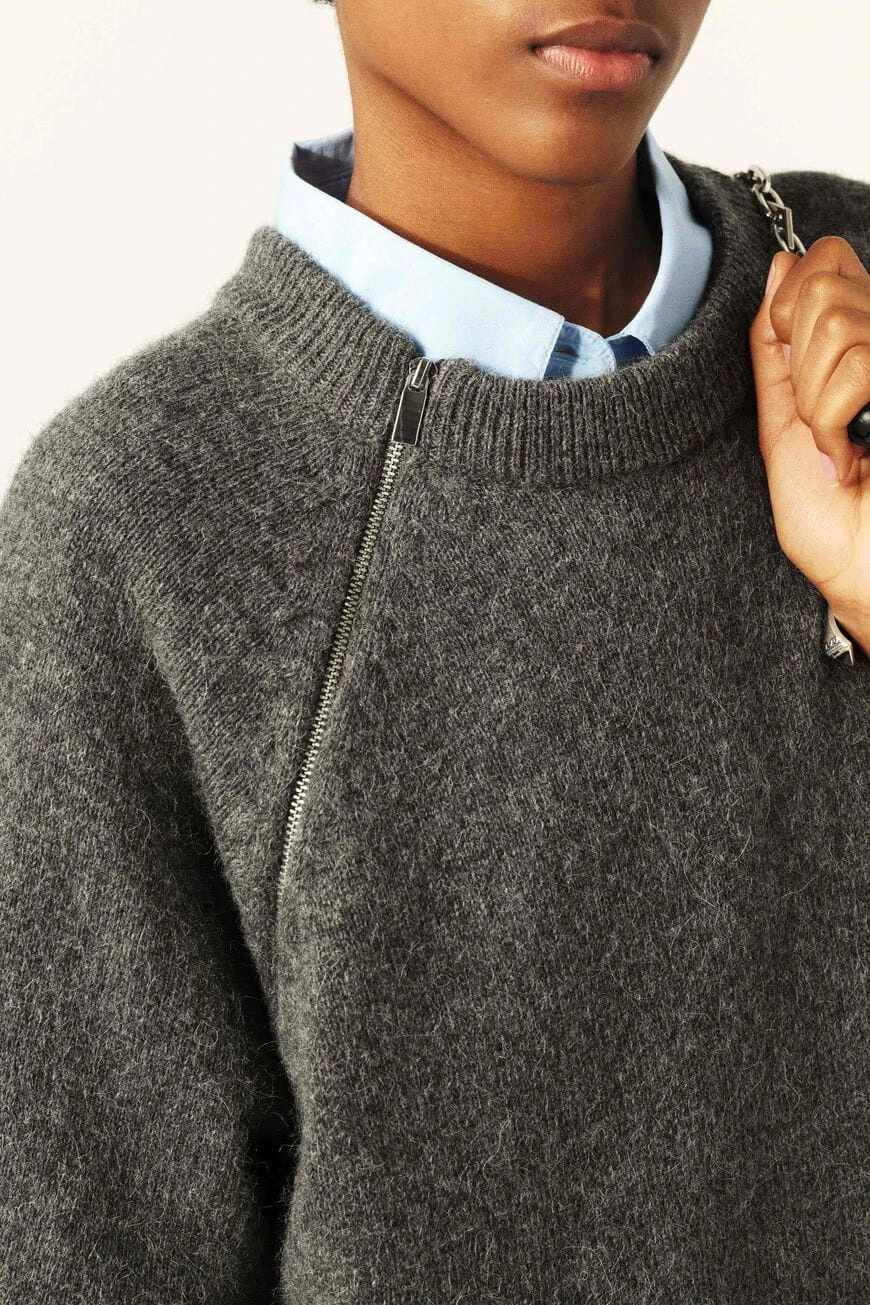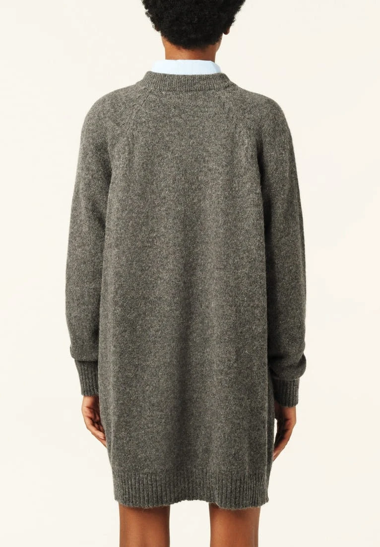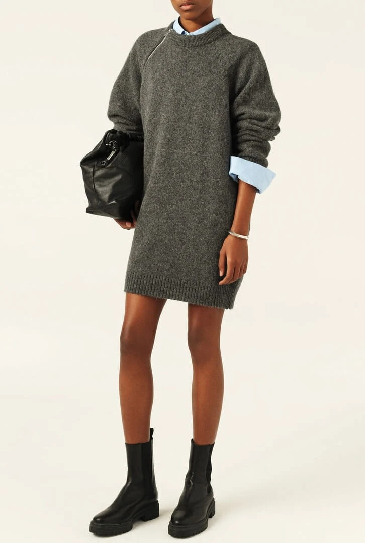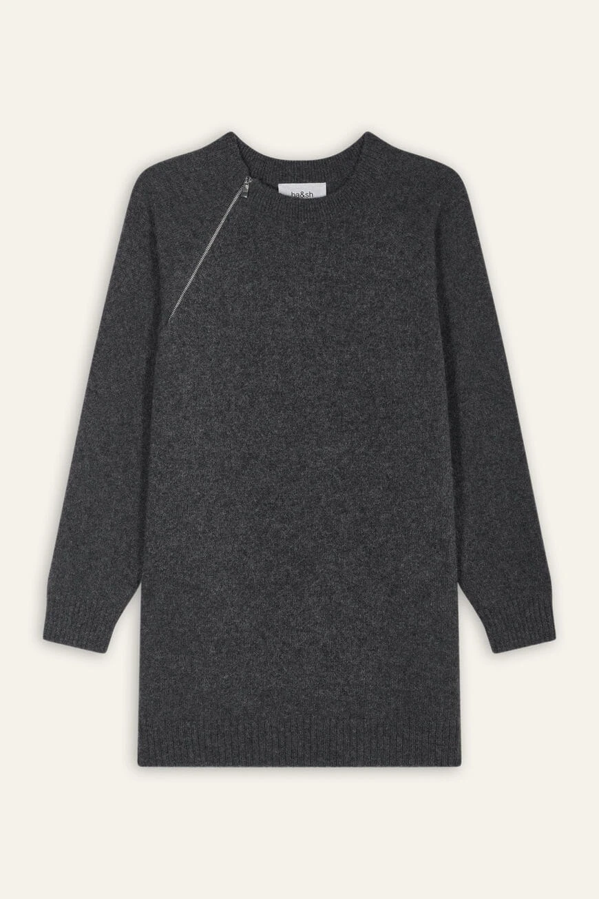 Dzianinowa sukienka marki ba&sh w kolorze szarym, wykonana z wełny. Ozdobne zapięcie na suwak oraz długie rękawy nadają jej nowoczesny i stylowy charakter. Idealna na chłodniejsze dni, łącząc komfort z elegancją.