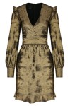 Szykowna sukienka w złotym kolorze to projekt włoskiego domu mody PINKO. Głęboki dekolt w kształcie litery „V”, ozdobne falbany na ramionach i spodzie sukienki oraz wszyty pasek w talii podkreślą twoją figurę, a odpowiednio dobrane dodatki sprawią, że będziesz wyglądać oszałamiająco.